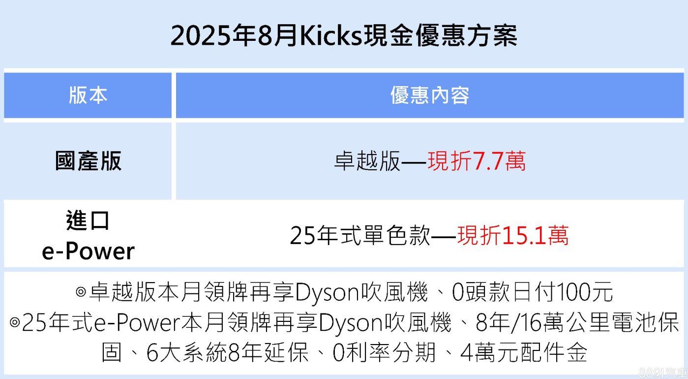 國產Kicks卓越版現折7.7萬元,再送Dyson吹風機與0頭款日付100元方案,輕鬆入主無壓力。進口Kicks e-Power(25年式單色款)下殺15.1萬元,配備三螢幕、BOSE音響、全景天窗,還有8年/16萬公里電池保固、0利率分期、4萬配件金等多重好康。