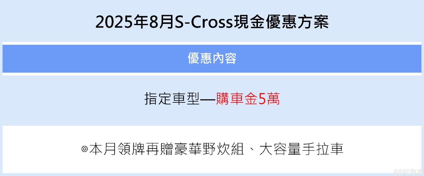 Suzuki S-Cross本月推出5萬元購車金,並加碼贈送豪華野炊組與大容量手拉車,針對熱愛戶外休閒的家庭用戶量身打造。S-Cross擁有歐系設計風格與實用空間,對重視機能與配備的買家相當有吸引力。