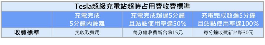原廠同時並計畫在國內導入超充站收費機制,超時佔用費將於7月起陸續開收,而超充使用費也規劃於下半年間實施。有關超時占用費,當超級充電站充電座使用率達50%以上時,完成充電的車輛每占用1分鐘酌收新台幣15元,當使用率達100%時將加倍計費;不過若於充電完成後5分鐘內將車輛駛離則不予計費。