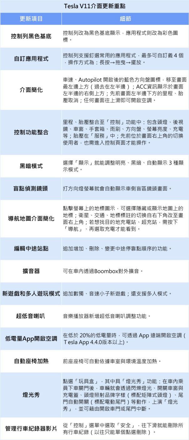Tesla V11介面更新內容豐富且多元,大致重點為介面簡化、操作邏輯調整、追加盲點偵測鏡頭與自動加熱前座椅,並增加更富趣味性的燈光秀、新遊戲等。