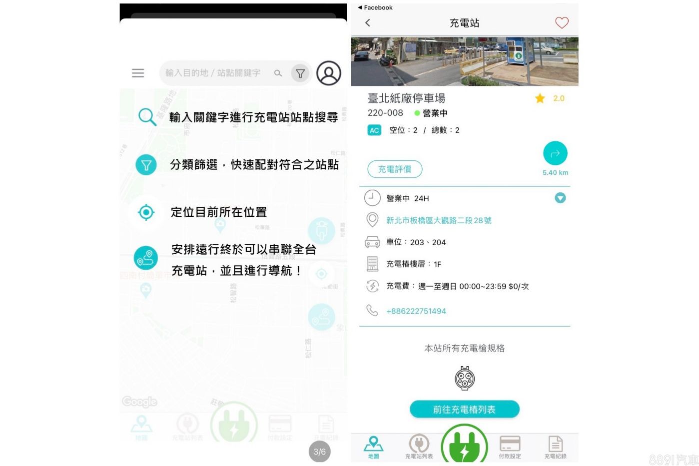 支援全球充電地圖的PlugShare,一樣簡單好上手,只要開啟App或是輸入目的地,就會顯示周遭充電站,點擊站點則可看到詳細資訊,如收費項目與金額、充電規格、開放時間、車位編號等。
