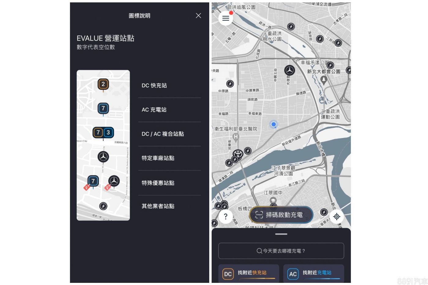 EVALUE和YES!來電的特色很像,也能顯示即時車位狀況,空位直接顯示在地圖圖邊上,不用點進去才看的到,一目了然,不過此功能目前也是適用自家華城電機的充電設備為主,當然也有提供他廠,以及有合作關係的賓士充電站點可一併查詢。