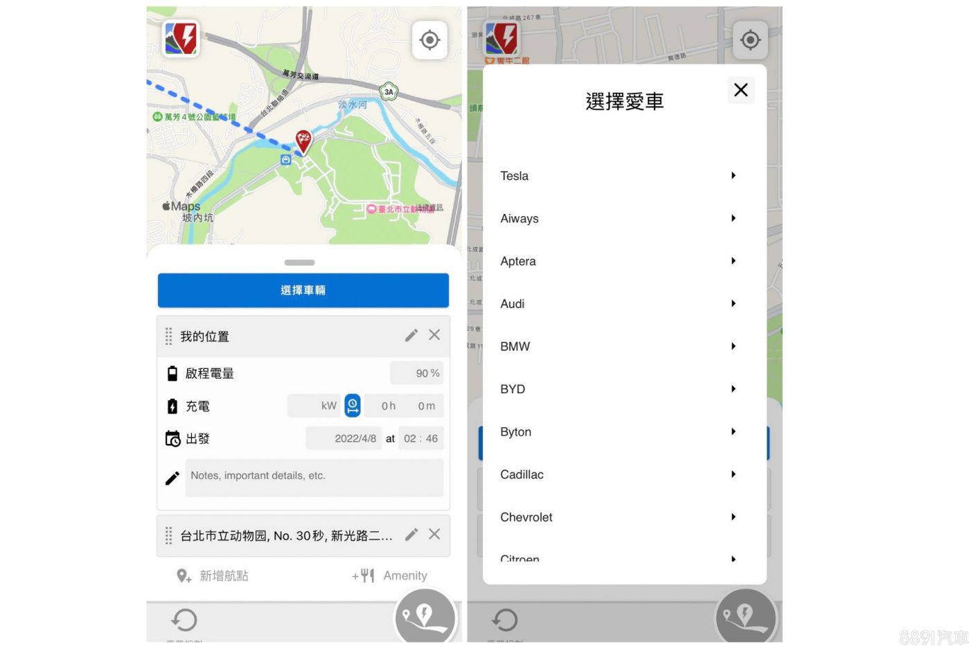 這款App算是「老牌子」了,主要功用是替你預估電量,並規劃中途有充電站的建議路線,特色有以下幾點,內建各車廠各年份各車型的電動車、能新增停留點,從A到B到C的每一個旅程都會有用電、剩餘電量與里程等的詳細資訊。