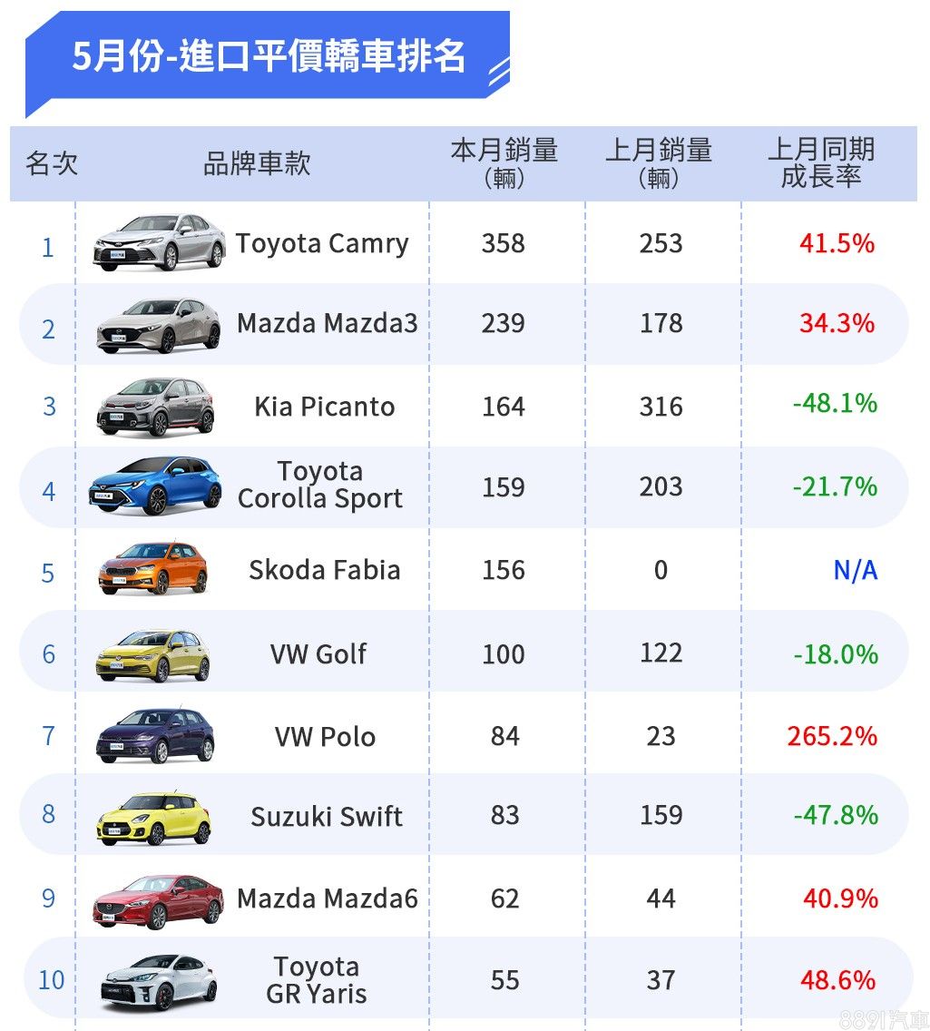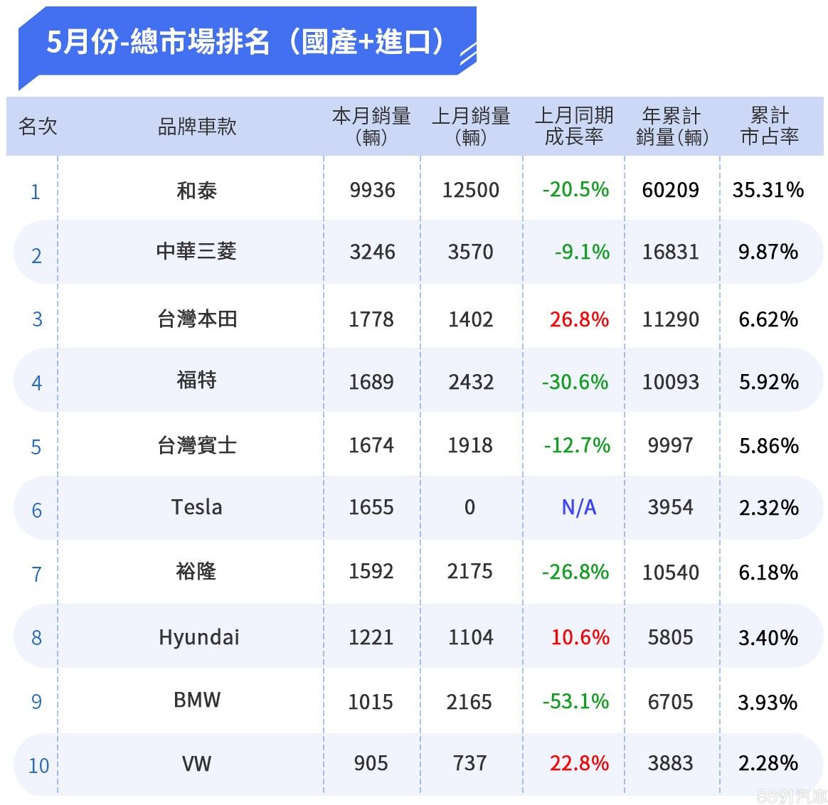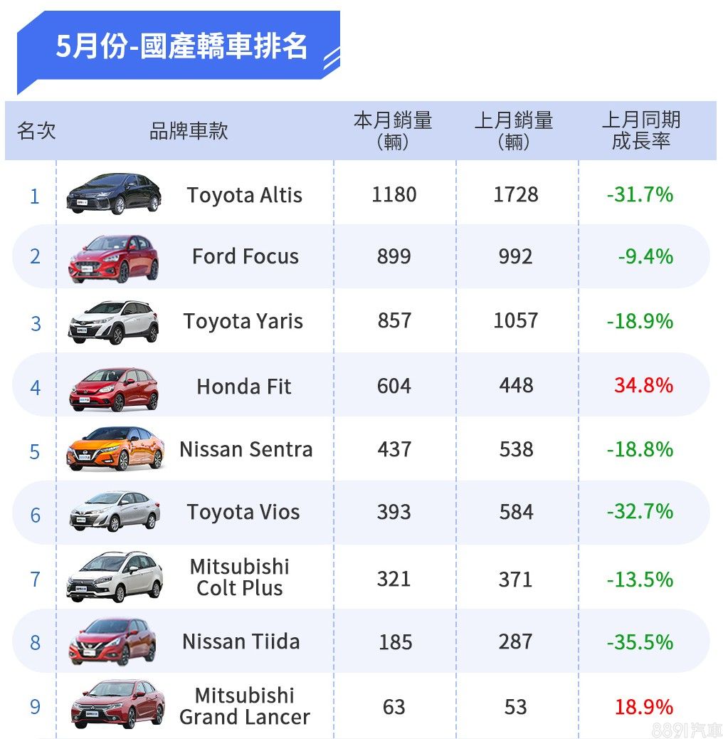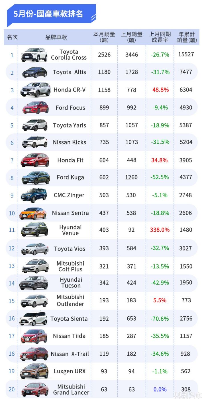 車款成績自然與品牌表現息息相關,國產龍頭和泰汽車,在5月分的成績未破萬台,算極少見的現象,前20名榜上的豐田車,也全數均為負成長之勢。