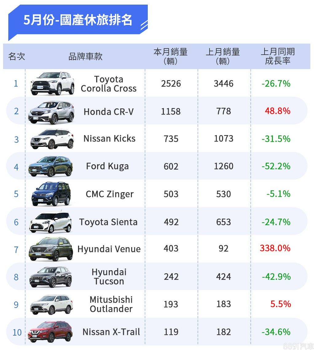 一如先前我們預測,國產車掛牌表現依舊未見明顯好轉,就如同4月、逾半數車款均為負成長,雖說如Honda CR-V、Hyundai Venue等,看似5月給出「萬綠叢中一點紅」的突出成績,但主因為4月衰退太多,如今也只是算的上正常發揮而已。