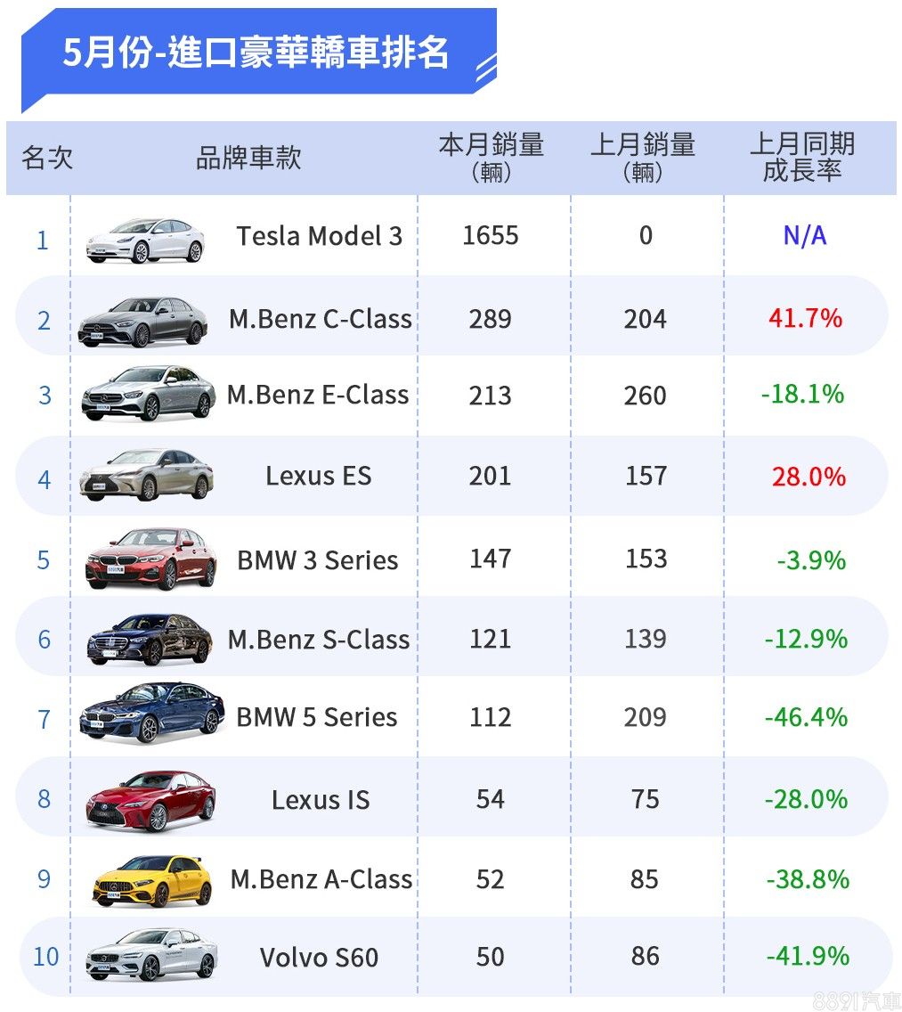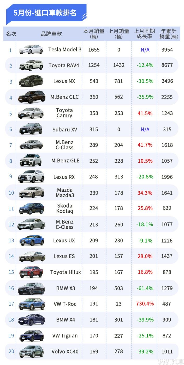 5月進口車榜首不是熟悉的RAV4,而是Model 3再度上演從榜外竄上冠軍的戲碼,其餘20名榜單的成員則多為熟面孔。而今年截至5月,進口車一共掛牌73145輛,較去年一口氣衰退17.9%之多,顯見進口車缺車情形仍未見緩解。