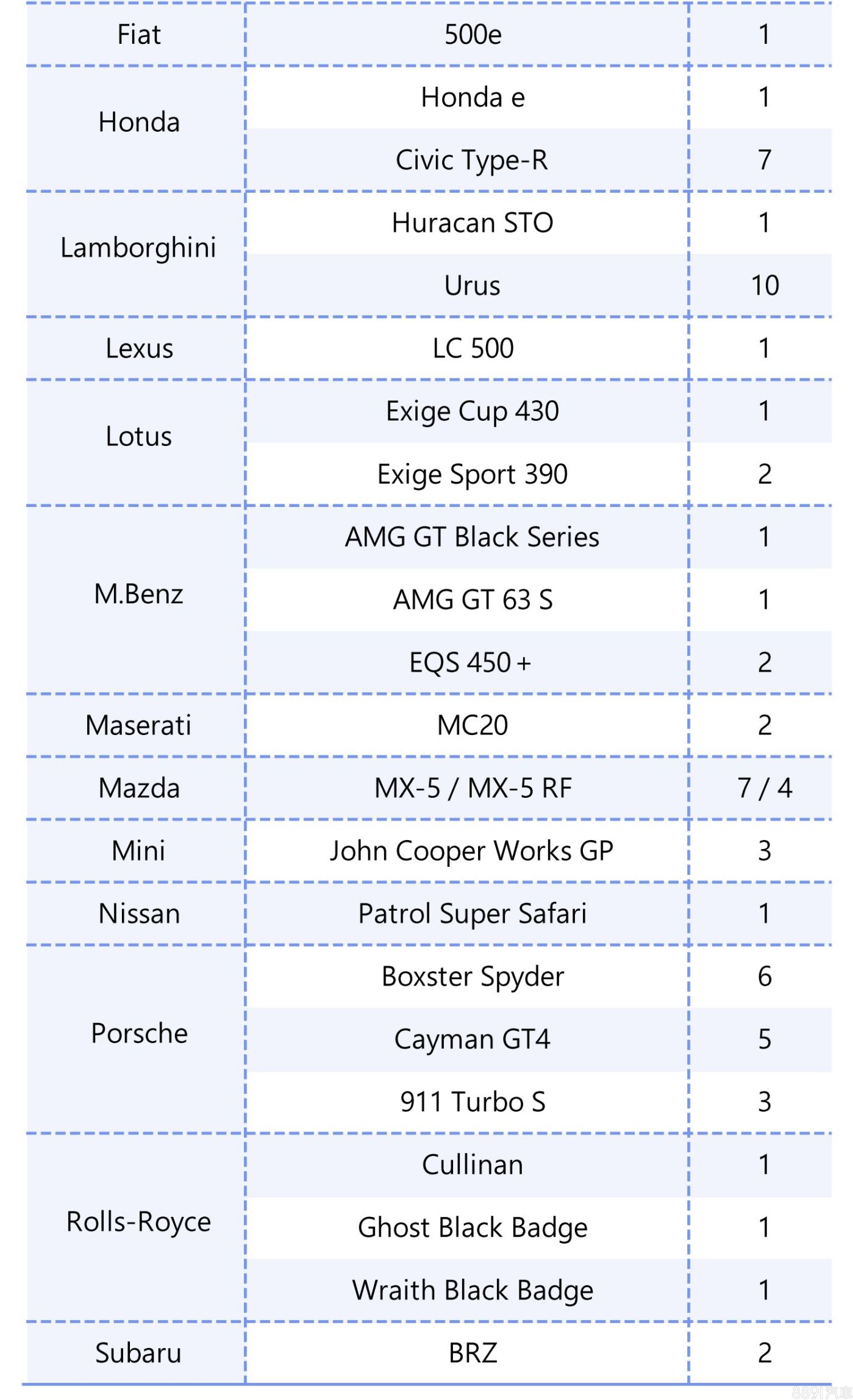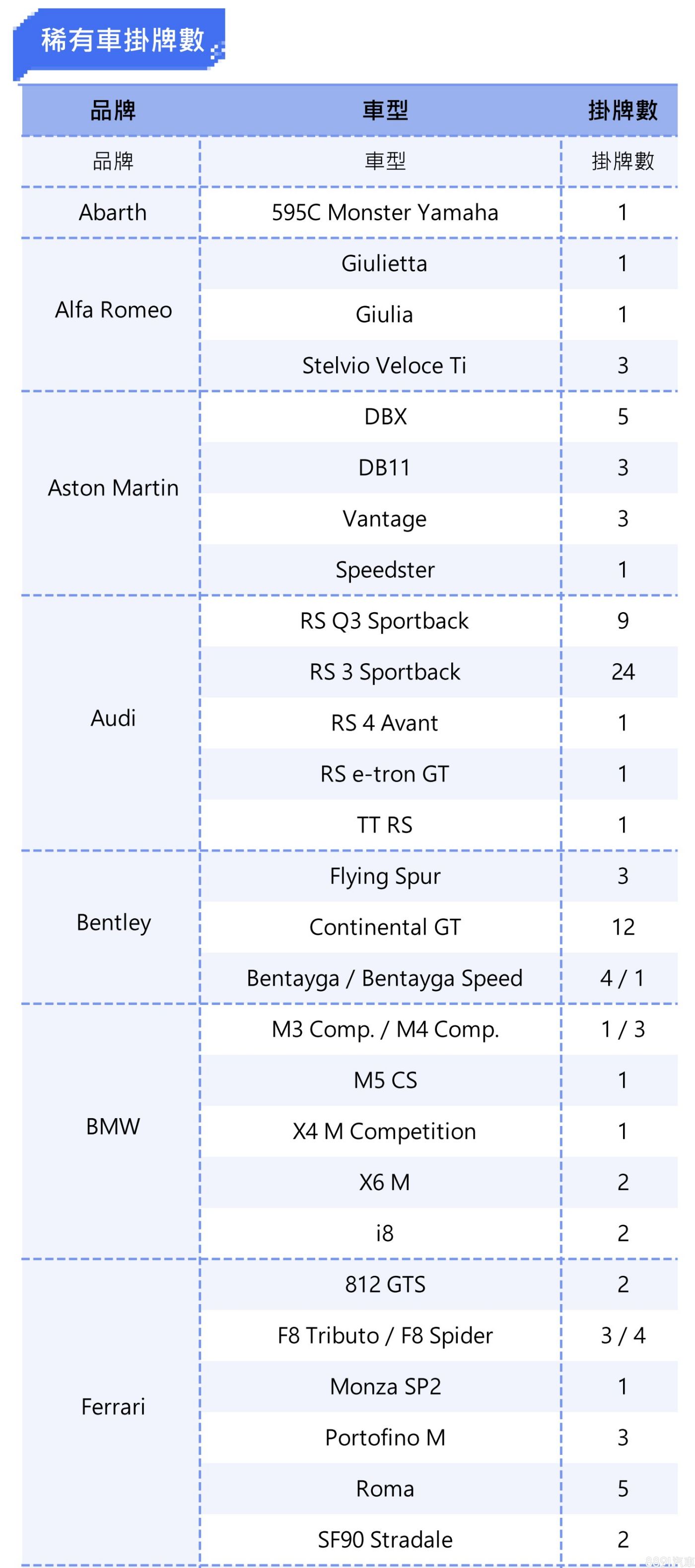 賓士大軍依舊火力凶猛,共有4款車上榜,依序為C-Class(289輛)、E-Class(213輛)、S-Class(121輛)以及A-Class(52輛),其中S-Class更在同級展現主宰力,力壓BMW 7系列、Lexus LS、Audi A8等一眾對手,「黑頭車」的形象深獲國內大老闆們喜愛。
