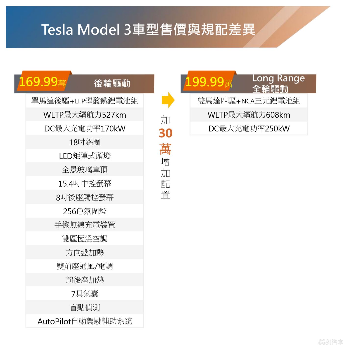 小改款Model 3提供後輪驅動、Long Range全輪驅動兩種車型,售價分別為169.99、199.99萬元,預計得等至5月才會開始交車,今天現場展出的版本為Long Range全輪驅動版本。