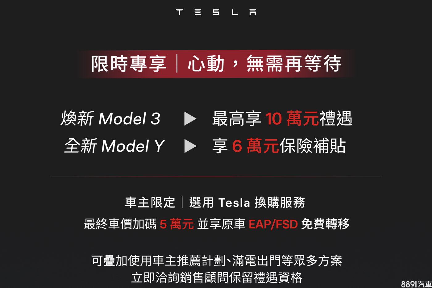 凡於2025年8/27至9/30期間交付Model 3最高省10萬,以最直接的車價折扣回饋消費者;至於Model Y雖自德國柏林廠進口,且目前沒有任何移產計畫,但Tesla仍祭出6萬保險補貼回饋給即將交付的新車主。