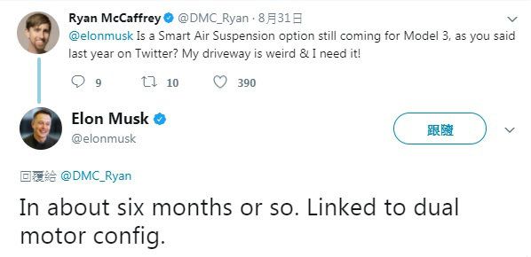 這名特斯拉車主在Twitter上發問,「自己很需要也期待智慧型氣壓式懸吊,Model 3什麼時候會提供」?而向來在社群平台對於客戶與網友的問題,都相當迅速回答的Elon Musk,也很快回覆這名車主的詢問。