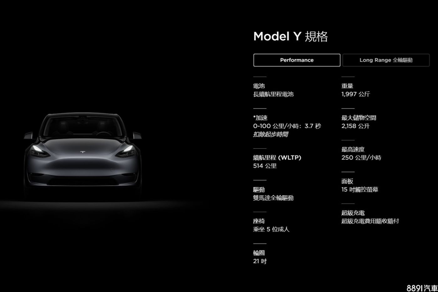 國內販售的Model Y皆為雙馬達四驅配置,據官方數據,Long Range與Performance兩車型0~100km/h加速成績分別為5秒與3.7秒,極速依序為217km/h與250km/h,在WLTP測試規範下,最大續航里程各為542km與514km。