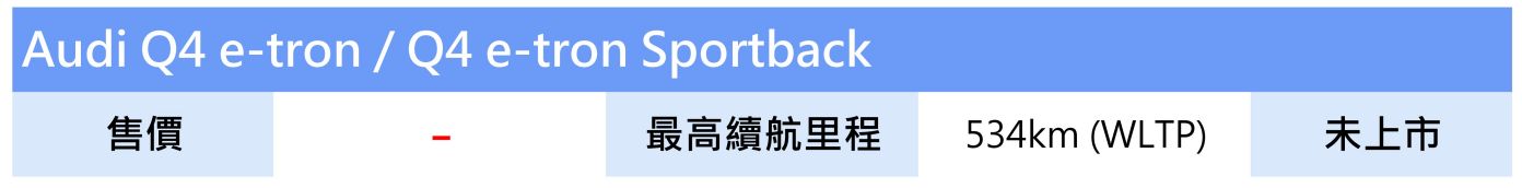 Q4 e-tron是繼e-tron後第二款四環純電休旅,同樣提供標準款和Sportback斜背版本,採VW集團MEB平台所開發,說是「豪華版ID.4」亦不為過。其中201hp單馬達後驅的Q4 Sportback 40 e-tron具備534km行駛里程,續航力為車系之冠。發表於去年年中的Q4,曾傳言明年間引進國內,但消息仍未獲官方所證實。
