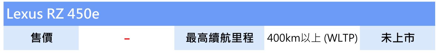 與Toyota bZ4X共享e-TNGA平台的Lexus RZ,比起小尺碼的UX 300e,在車格上與Model Y更接近。目前官方僅推出RZ 450e單一規格,採201hp前馬達和107hp後馬達的雙馬達四驅設定,宣稱在WLTP測試標準下,可提供超過400km的續航表現。雖說和泰曾喊話爭取RZ於第四季導入,但稍早證實上市規劃將延後至明年間。