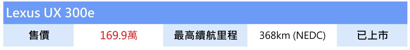 UX 300e為Lexus UX衍伸而來的純電車型,也是品牌首款電動車,去年在台上市後便以170萬有找的價格成為國內最便宜的純電豪華休旅,配置204hp前驅單馬達及54.35kWh的電池組,官方宣稱在NEDC標準下具備368km續航力。