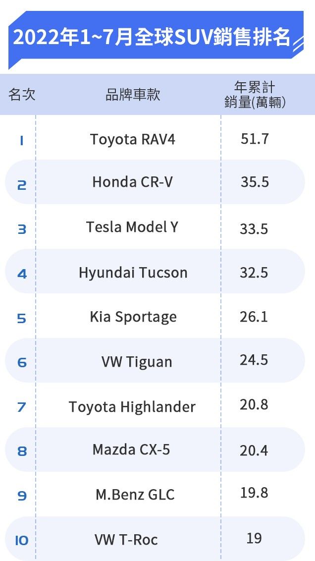 雖然目前僅公布今年1至7月的統計數據,但已可看出各車款「大勢」,延續2020和2021年度佳績,Toyota RAV4持續穩坐全球休旅王寶座,且幾乎是以壓倒性的數據贏過榜上眾多車款。