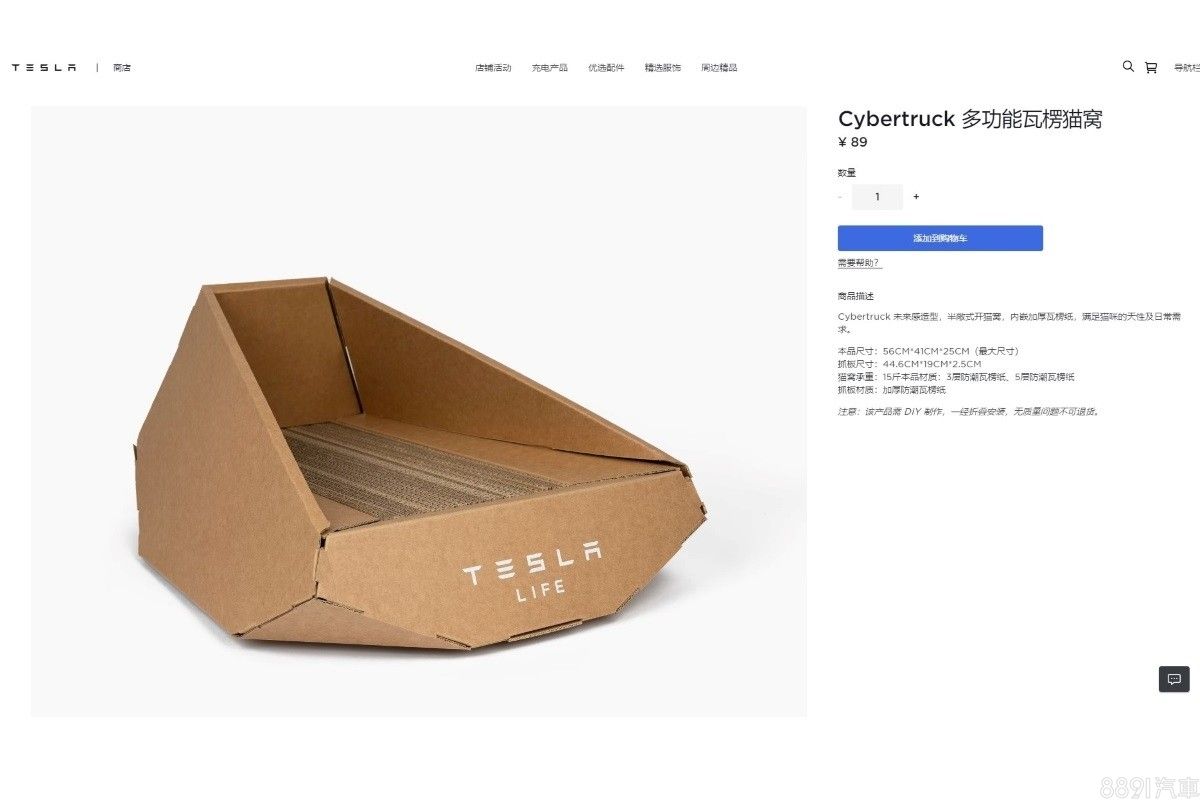 Tesla中國官網日前上架周邊商品「多功能瓦楞貓窩」,定價人民幣89元,折合約新台幣373元,造型是以旗下貨卡車系Cybertruck為靈感,構造由紙板摺疊、拼接而成,採用半敞開式的設計,內部還嵌入加厚瓦楞紙作為貓抓板使用,吸引不少貓奴關注!
