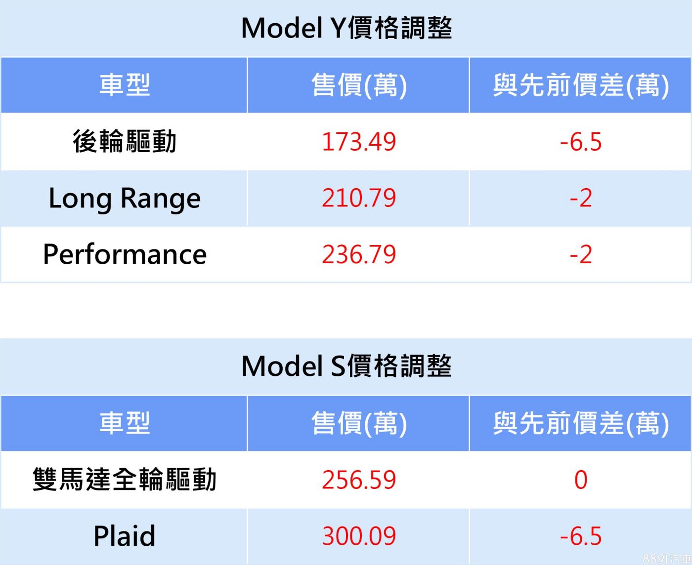 Model S車系中,入門的雙馬達全輪驅動車型,維持既有售價:256.59萬元,至於頂規Plaid車型,則降了6.5萬、開價為300.09萬元。
