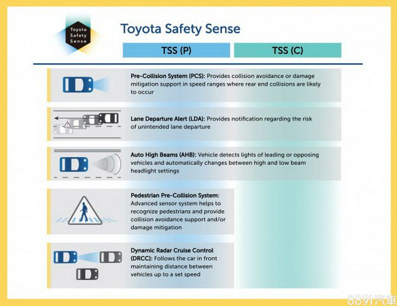 小改款重點在於安全輔助項目的升級,將標配TSS-P(Toyota Safety Sense P),包含具行人偵測及自動緊急煞車功能的pre-collision預撞防護系統、ACC主動式巡航、LDA車道偏離警示、AHB智慧型遠光燈切換等,BSM盲點偵測也會入列。