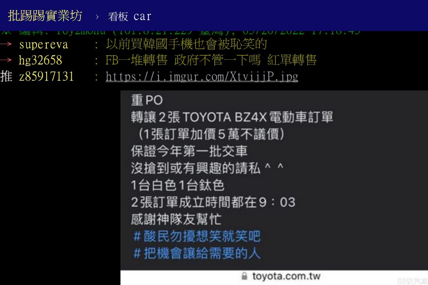 可別以為這狀況只是「他國事務」。bZ4X上周在台灣開放搶訂300輛今年配額,隨即有網友發現有黃牛在臉書上以加價5萬的方式抬價兜售,讓不少真正對bZ4X有興趣的買家看了直呼搖頭。