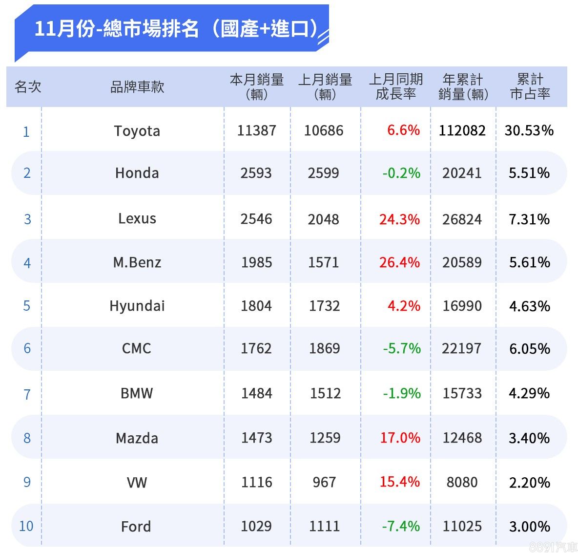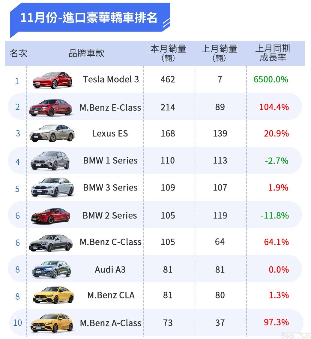 11月進口車登錄台數18124輛、月增18%,成長幅度比總市場的5%還高,顯見進口車氣勢更暢旺,多數品牌相比10月都是「電梯向上」,推測可能是貨物稅新政策紅利,再加上車商針對庫存車年末清倉促銷,讓掛牌數出現明顯上漲!