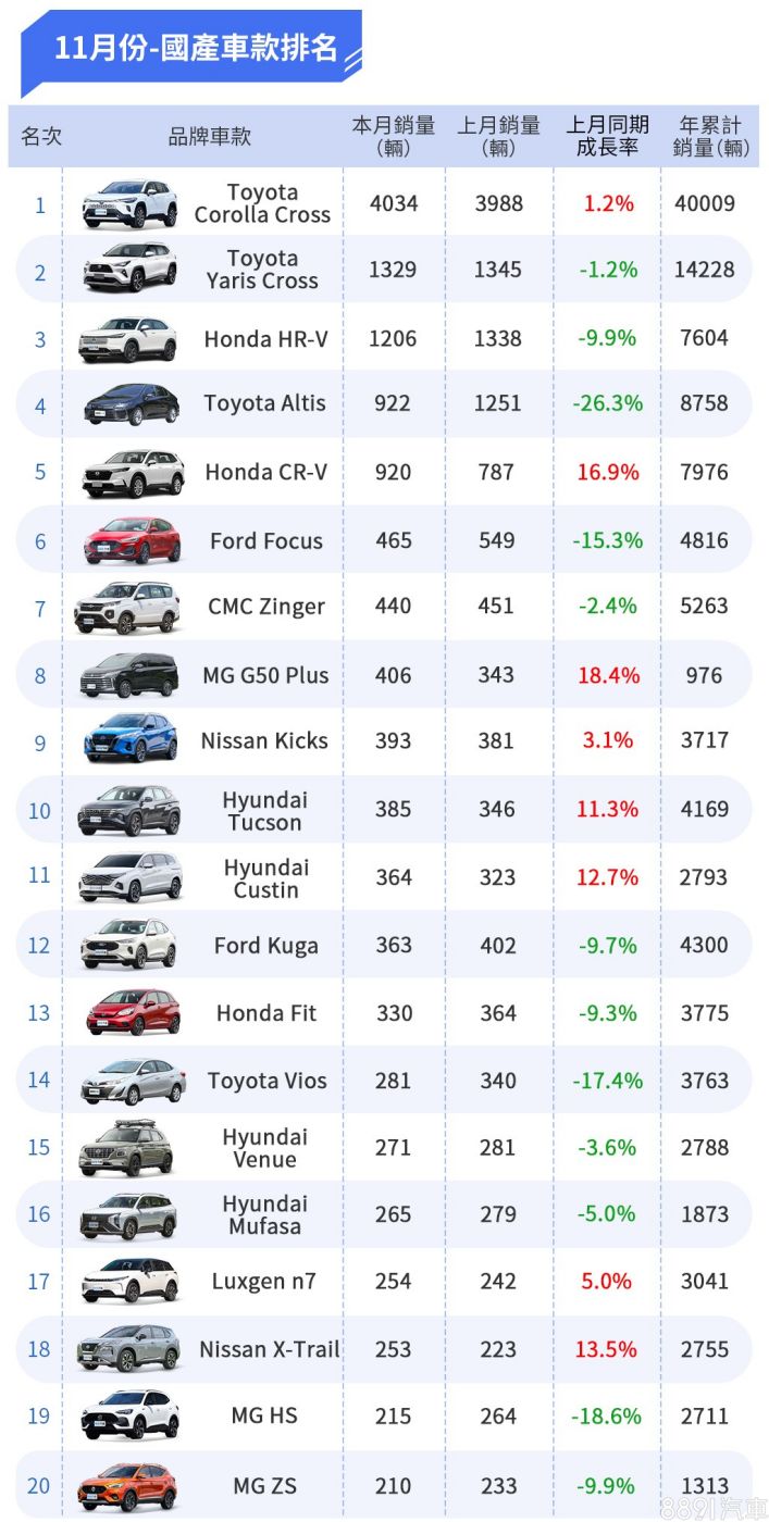 毫無意外,11月份國產車市的冠軍寶座依然由「神車」Toyota Corolla Cross強勢霸佔。單月4034輛的掛牌數,不僅是全市場唯一突破4千大關的車款,更以超過第二名兩倍的銷量差距,展現了令人絕望的統治力,即便上市已有一段時間,CC憑藉著無懈可擊的品牌光環、適切的空間與動力配置,依然是台灣家庭買家的首選。緊追在後的是同門師弟Toyota Yaris Cross,以1329輛穩居亞軍,成功承接了入門休旅的龐大需求。而季軍則由Honda HR-V驚險守住,雖然受到強敵環伺,本月仍繳出1206輛的成績,證明其機能性與油電動力的黃金組合,在跨界休旅市場中仍佔有一席之地。