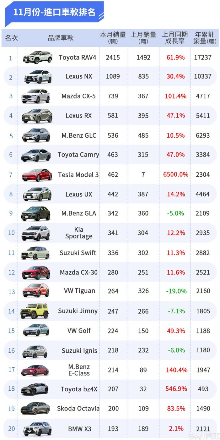 個別品牌中,Toyota進口車11月領牌3924輛為最多、月增45.6%,其次為Lexus的2546輛(+24.3%)、M.Benz的1985輛(+26.4%)。不過單以成長率來看,10月全面熄火、僅售出21輛的Tesla,本月迎來一波新車到港,掛牌數衝到532輛,取得2433%的驚人漲幅。