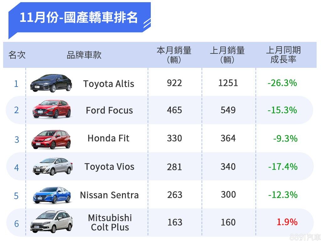曾經叱吒風雲的國產房車市場,如今已成休旅車崛起的最大受災戶。昔日霸主Toyota Altis本月掛牌數滑落至922輛,罕見地跌破千輛大關,月衰退幅度更高達26.3%,這無疑是對房車市場發出的一記強烈警訊。緊追在後的Ford Focus同樣難逃厄運,銷量下滑至465輛,衰退15.3%。這兩款曾是年輕人與家庭首選的指標車型,如今在自家休旅兄弟Corolla Cross與Territory的夾擊下,生存空間遭到嚴重擠壓,不得不面臨轉型或調整配備以求生存的嚴峻課題。