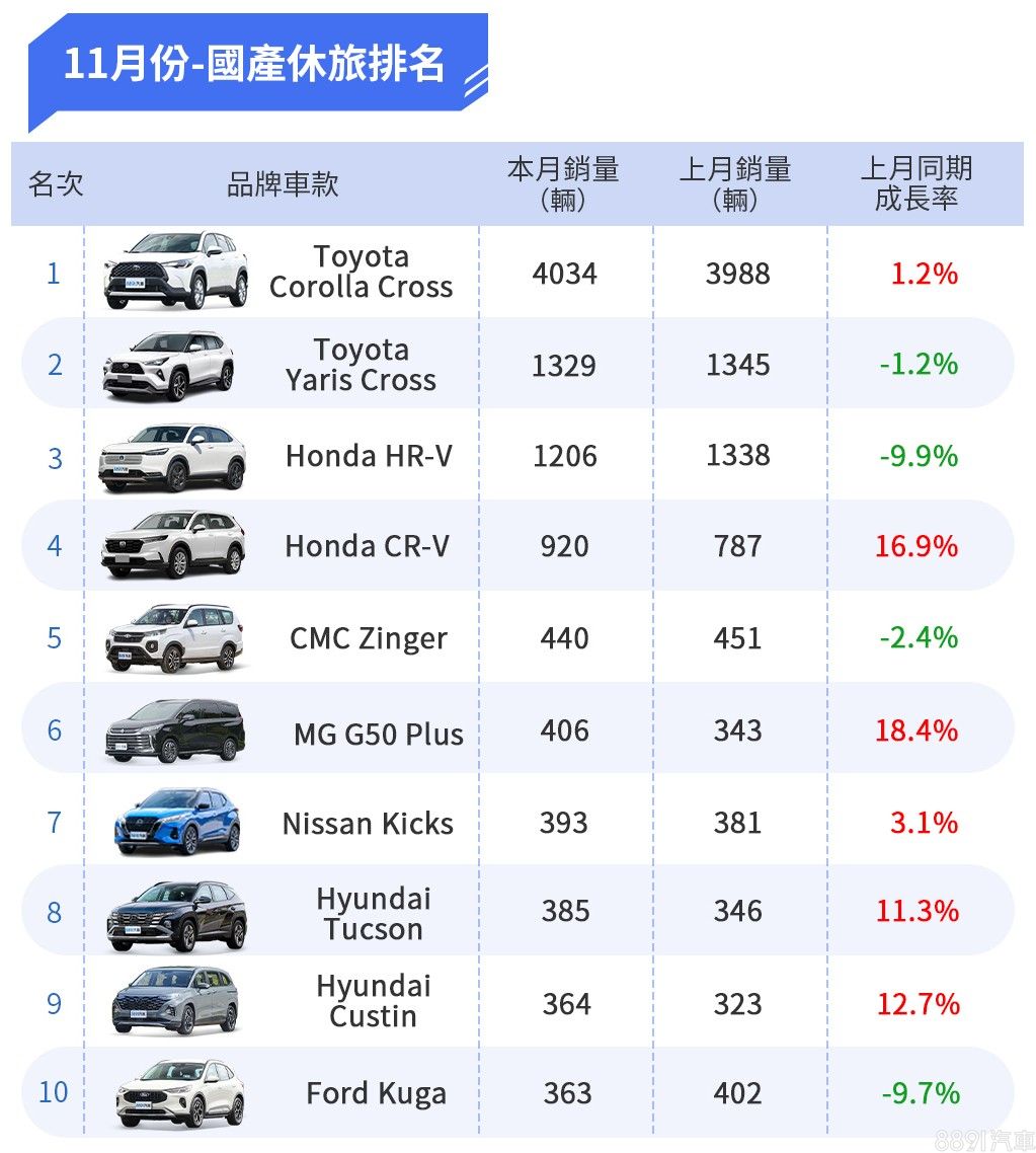 在這一片紅海中,有幾款車的表現特別值得關注。首先是MG的全新7人座休旅G50 Plus,本月掛牌406輛,月成長率達到18.4%,是榜單中成長幅度最高的車款,以親民的價格切入多人座級距,顯然策略奏效。此外,Honda CR-V也擺脫了前幾個月的低迷,本月銷量回升至920輛,成長率達16.9%,顯示原廠的促銷方案成功刺激了買氣。同樣表現不俗的還有Hyundai Tucson L與Nissan X-Trail,分別繳出11.3%與13.5%的雙位數成長,證明只要產品力足夠,在年底衝刺階段依然能獲得消費者青睞。