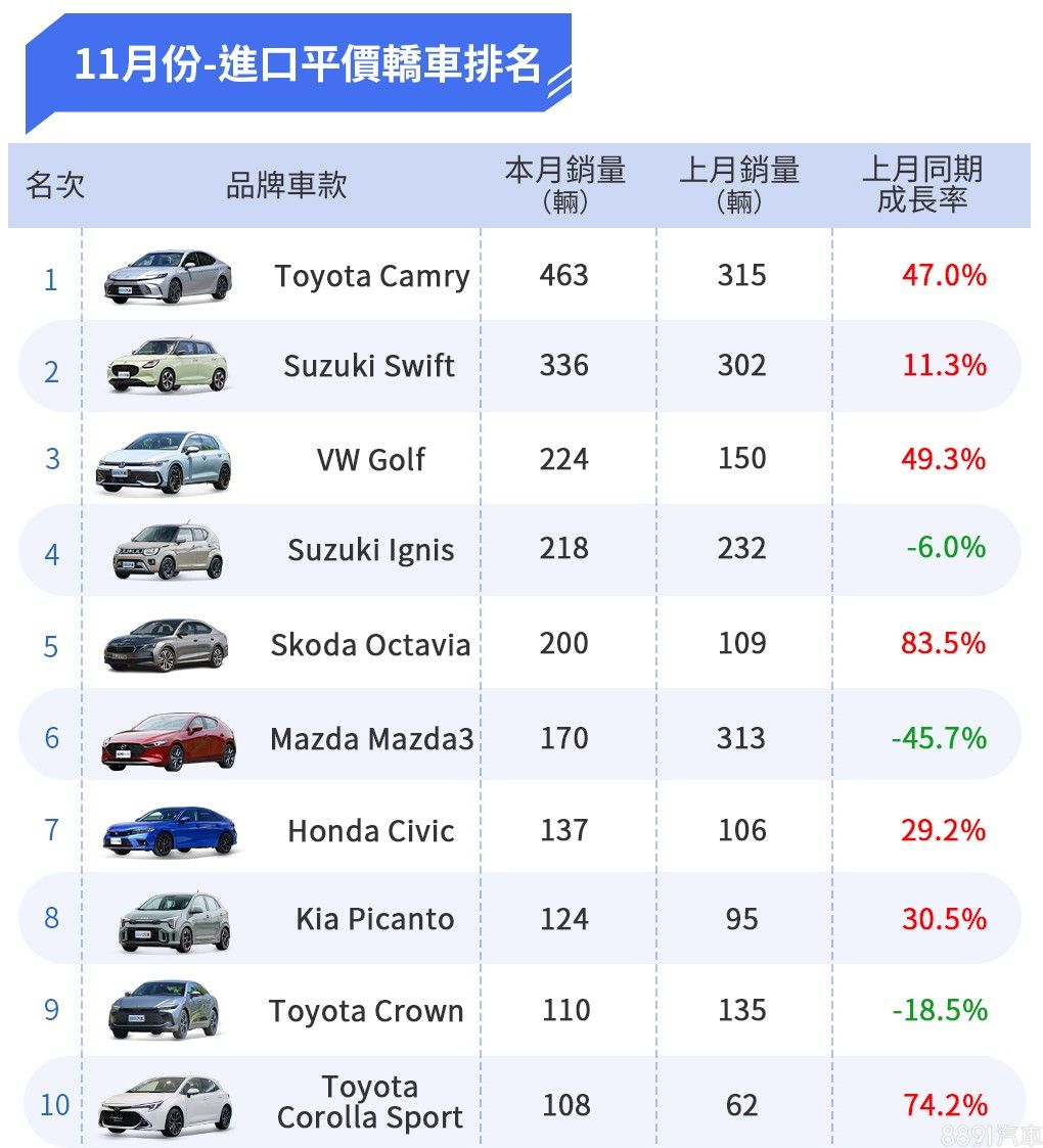 進口平價轎車Top 10本月出現較大浮動,除了榜首Camry屹立不搖外,其餘位置皆有排名變化,主要便是10月在榜的Peugeot 408與Toyota GR Yaris,皆因交車數大跌而退出競爭行列,取而代之的是Kia Picanto與Toyota Corolla Sport新進榜。