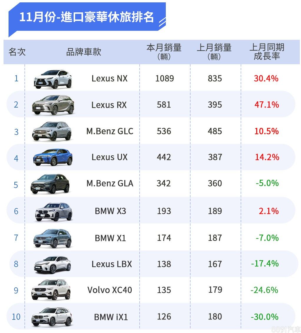進口豪華休旅榜單,榜首依舊是Lexus NX,繳出1089輛、成長3成的成績單,是本月唯一破千台的高級車;而1~11月年度累積方面,掛牌數來到10337輛,同時也是目前唯一破萬台高級車,與排名第二的Model Y(8260輛)拉開差距,看來是提早鎖定「豪華神車」的頭銜!
