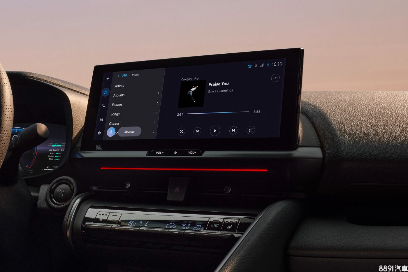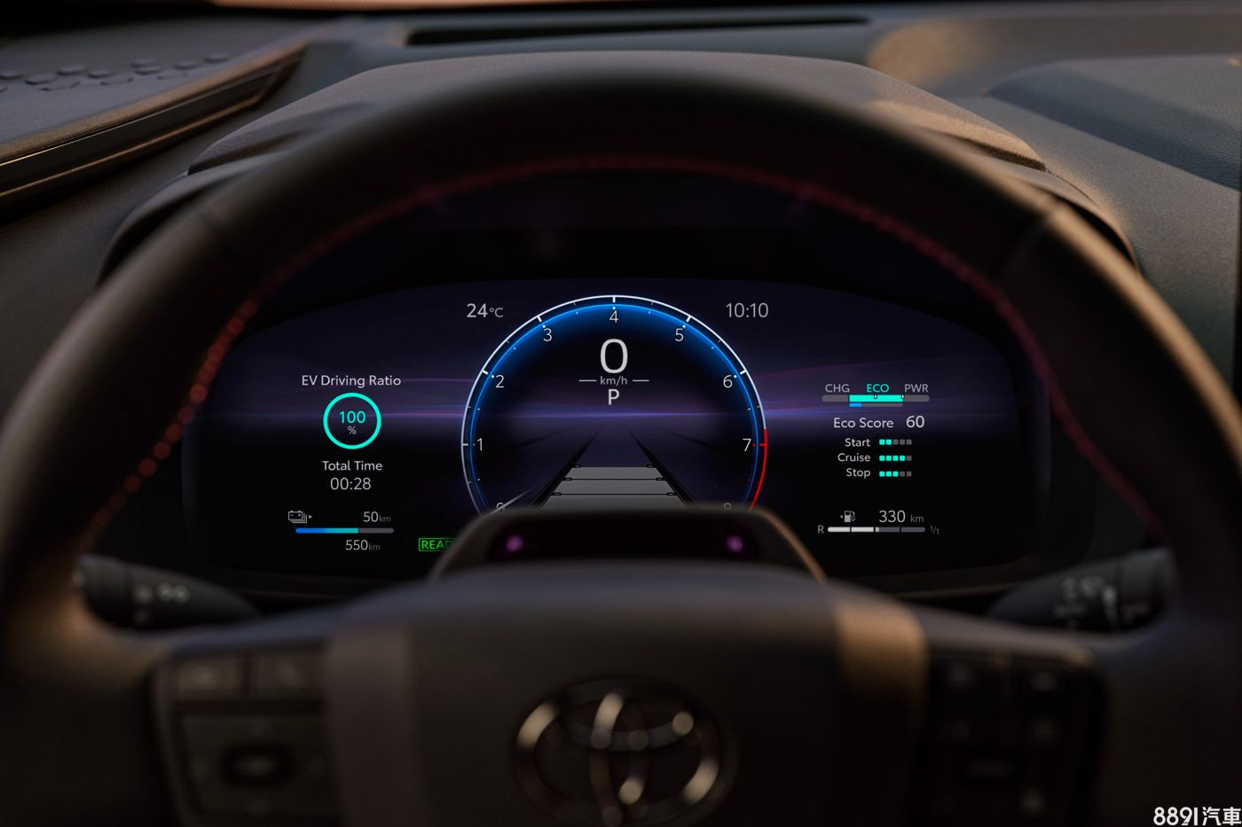 車室一改先前多以曲線鋪陳的格局,大量使用水平線條,前座出風口輪廓則改為圓形,GR Sport Premiere Edition除了新款方向盤上有專屬徽飾,亦加入紅色車縫線,原廠為新車導入包含可與主動安全輔助科技搭配使用的64色氛圍燈,例如安全下車警示作動時,車內照明會自動變為紅色,另數位鑰匙、JBL音響系統、最新的TSS等配備也入列。
