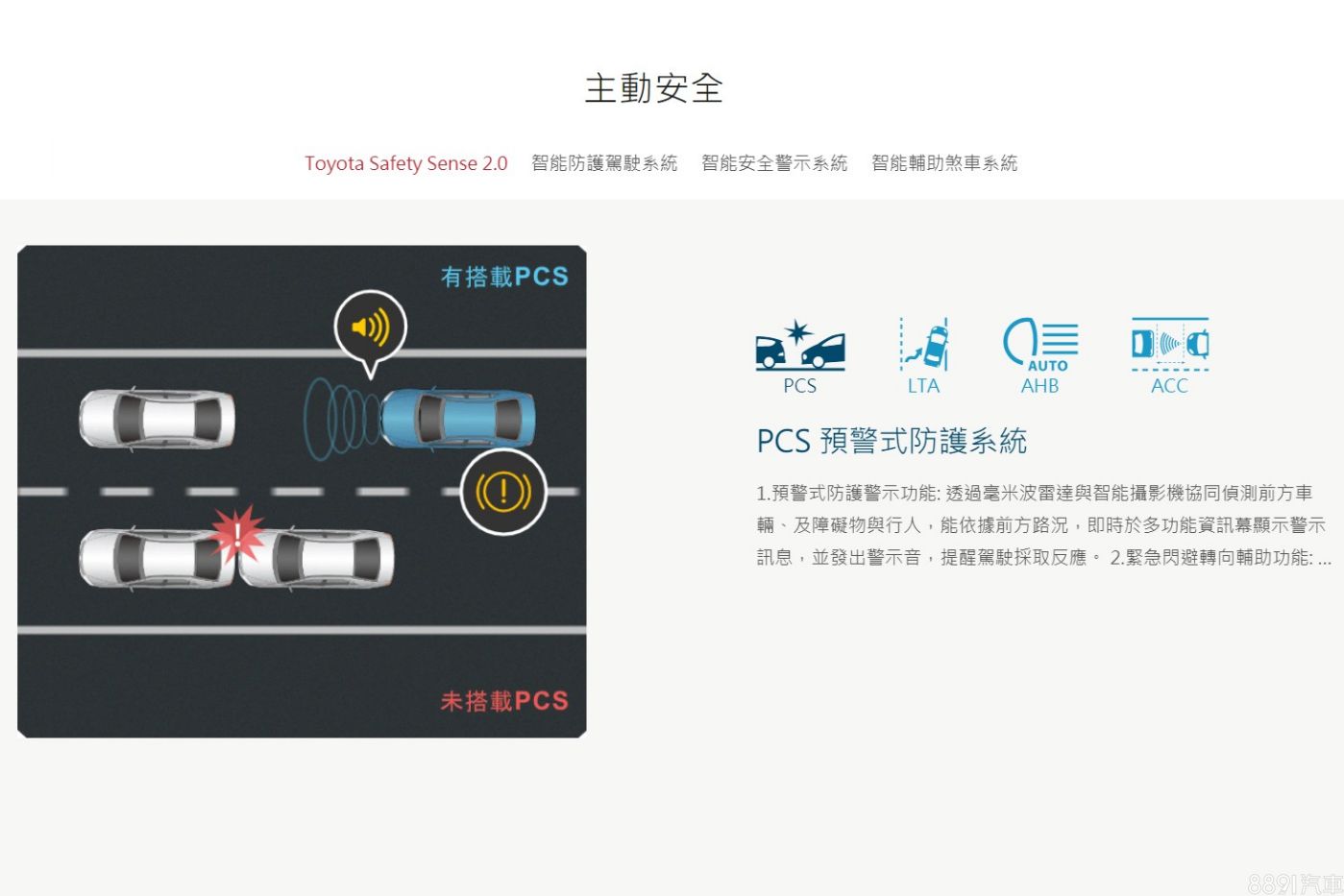 安全輔助雖未比照海外的TSS 2.5系統,但列全車系標配的TSS 2.0版本,輔助功能仍較原款更為豐富,並於小改Camry上增加全速域ACC及LTA車道置中輔助機能,而PCS前方碰撞預警也在導入主動煞車輔助外,將既有的前方偵測警示功能升級為全天候作動。