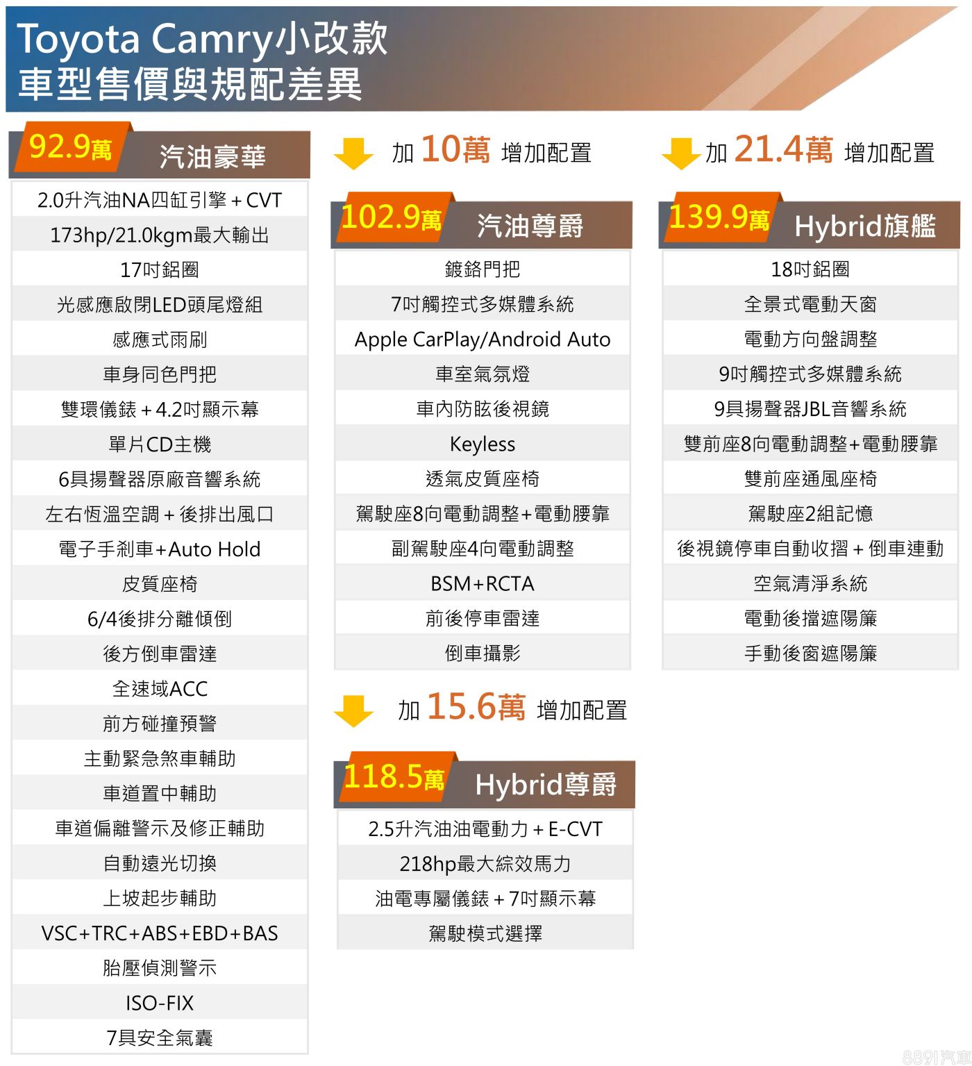小改款Toyota Camry正式在台上市,維持進口身分,車系陣容新增汽油尊爵款,讓編成自三車型增加至四車型,整體內外造型比造海外市場設計,國內車型並調整汽油款動力安排,唯海外車型搭載的TSS 2.5安全輔助系統並未見導入,但售價在調整後打入百萬內,92.9萬的起始價將入手門檻一舉下修14萬!。