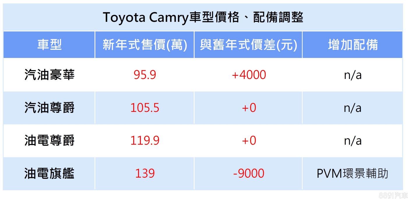新年式Camry維持4車型編成,汽油入門版上漲4000元,配備未見調整,但油電頂規不僅導入PVM環景影像系統,售價還逆勢調降9000元,這在「大漲價」時代算是少見。