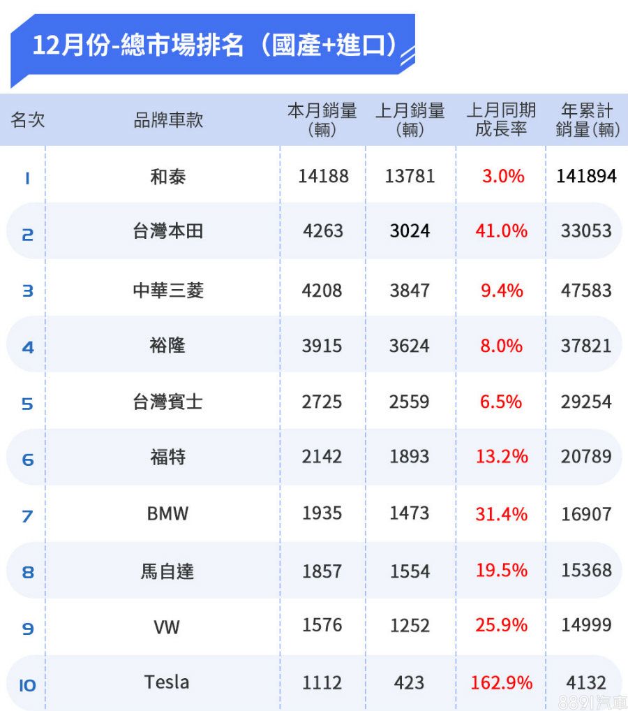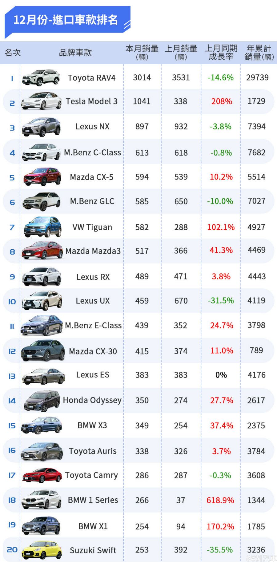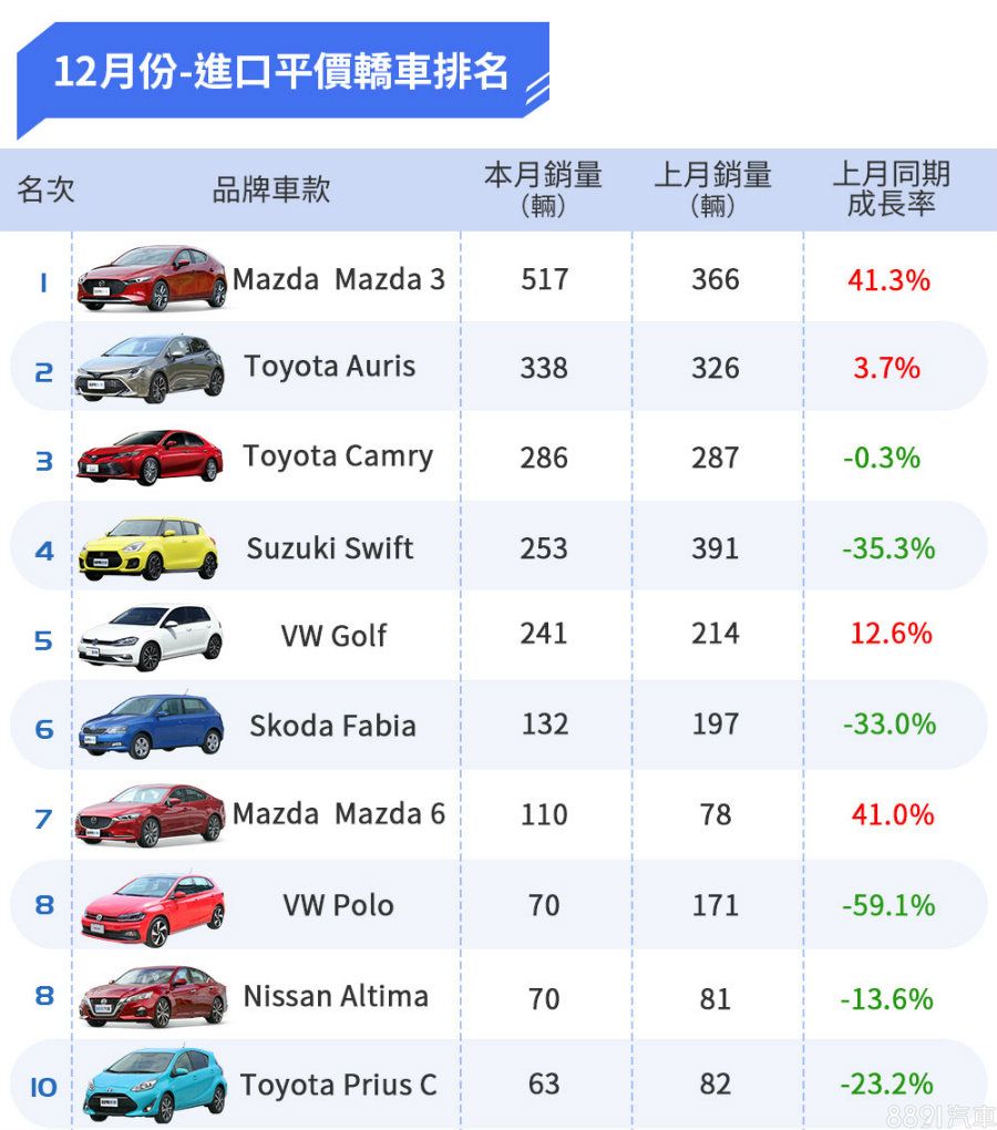 上個月一度登上組別冠軍的Swift,於12月份銷售回穩至2字頭,最終以第四名成績做收。