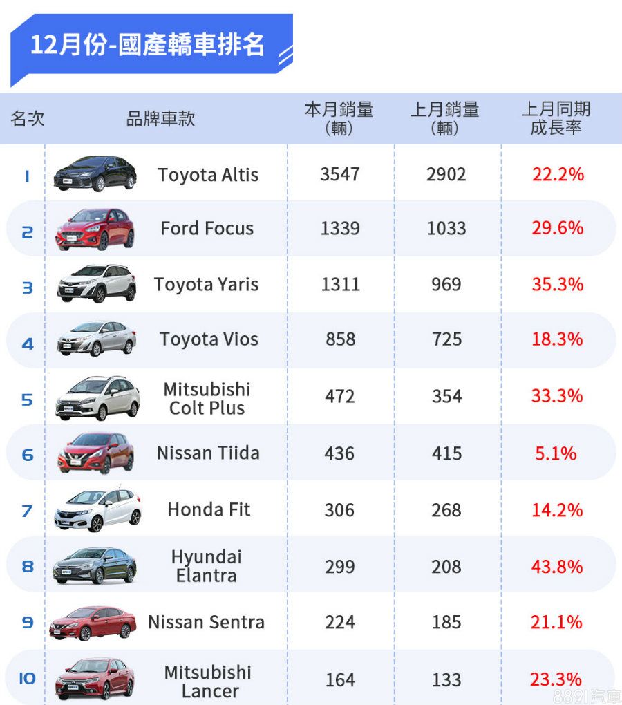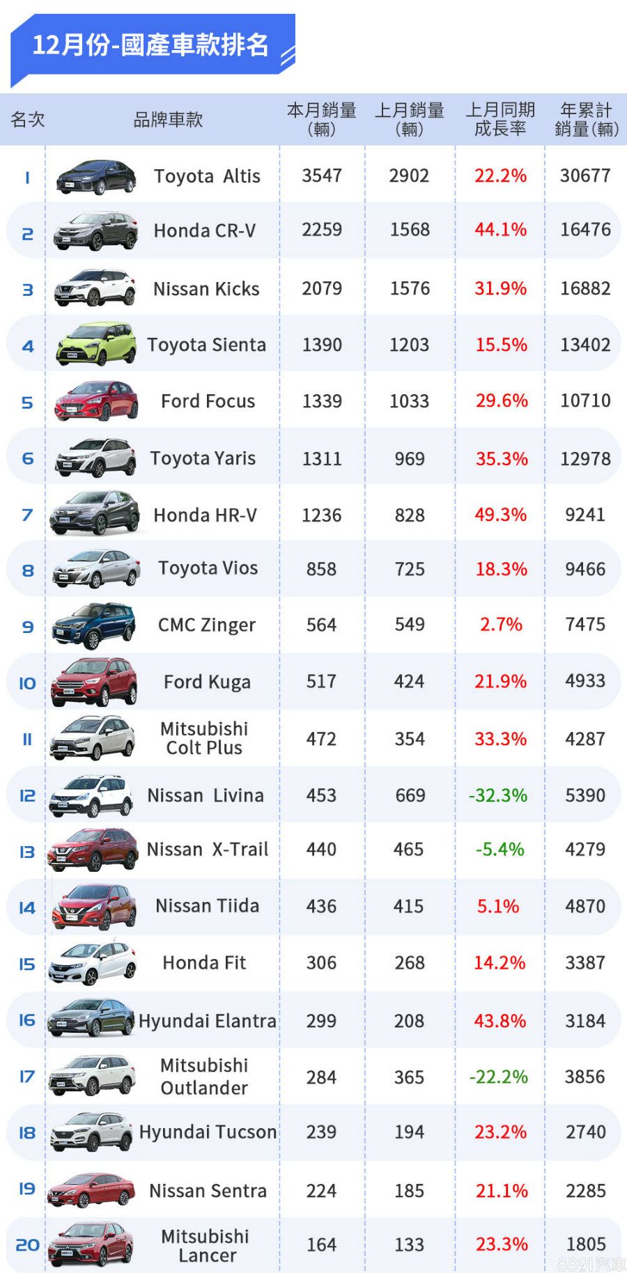 國產車市在12月繳出了23,843輛的成績,較上月增加了8,009輛,幾乎各品牌各車款皆呈現成長的狀態,僅有一些較舊款的車輛表現較上月更差,而其中Altis重新站回了神車寶座,本月繳出了3,547輛的成績,恢復了過往的銷售水準,年度銷售量更是突破了3萬輛大關。