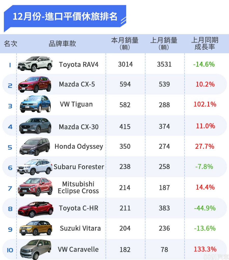 進口平價休旅市場不意外地仍由RAV4佔據首位,破3000輛的掛牌數遠遠傲視進口市場其他車款,而同屬中型級距的CX-5及Tiguan則分別拿下12月份的二、三名次。