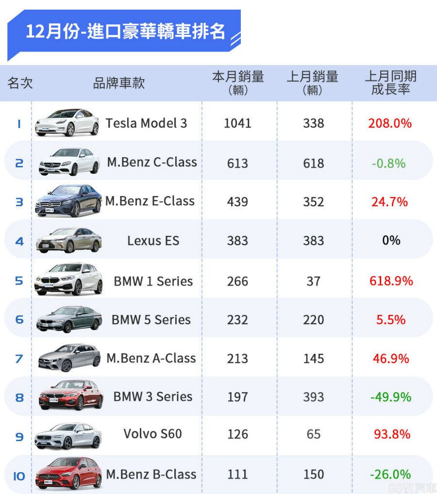 下半年進軍進口豪華市場的Model 3,在12月掛牌數達到1041輛,是當月進口市場中除RAV4外,唯一能夠破千銷量者。