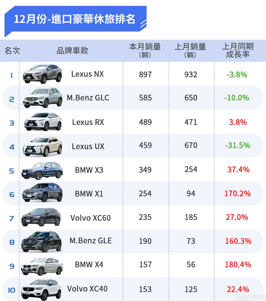 年底新車到港,Lexus包含RX、NX、UX原本就以頗佳的銷售成績更上一層,BMW於年末「衝一波」,除了體現於品牌整體銷售,休旅產品如X1、X4、X3等都上榜。
