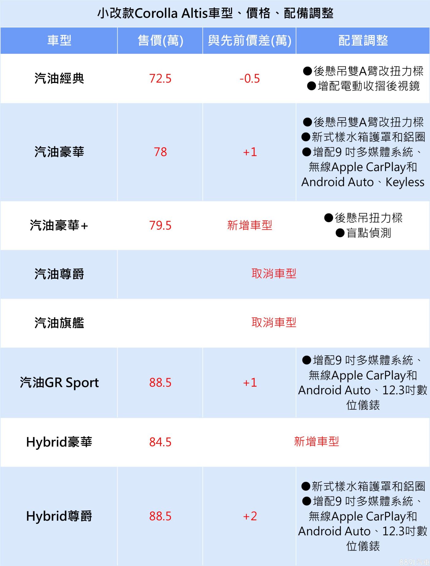 Toyota Corolla Altis在台持續提供1.8升汽油與油電兩種動力,汽油版本取消了尊爵和旗艦車型,新增豪華+車型,採4車型編成;油電版本則取消旗艦車型,為3車型編成,售價方面僅汽油入門略少了0.5萬,其餘均有1至2萬之漲幅,配備則導入新式樣鋁圈和水箱護罩,高階版本除了多媒體系統螢幕加大,也擁有12.3吋數位儀錶,編成、售價與配置重點調整如附表。
