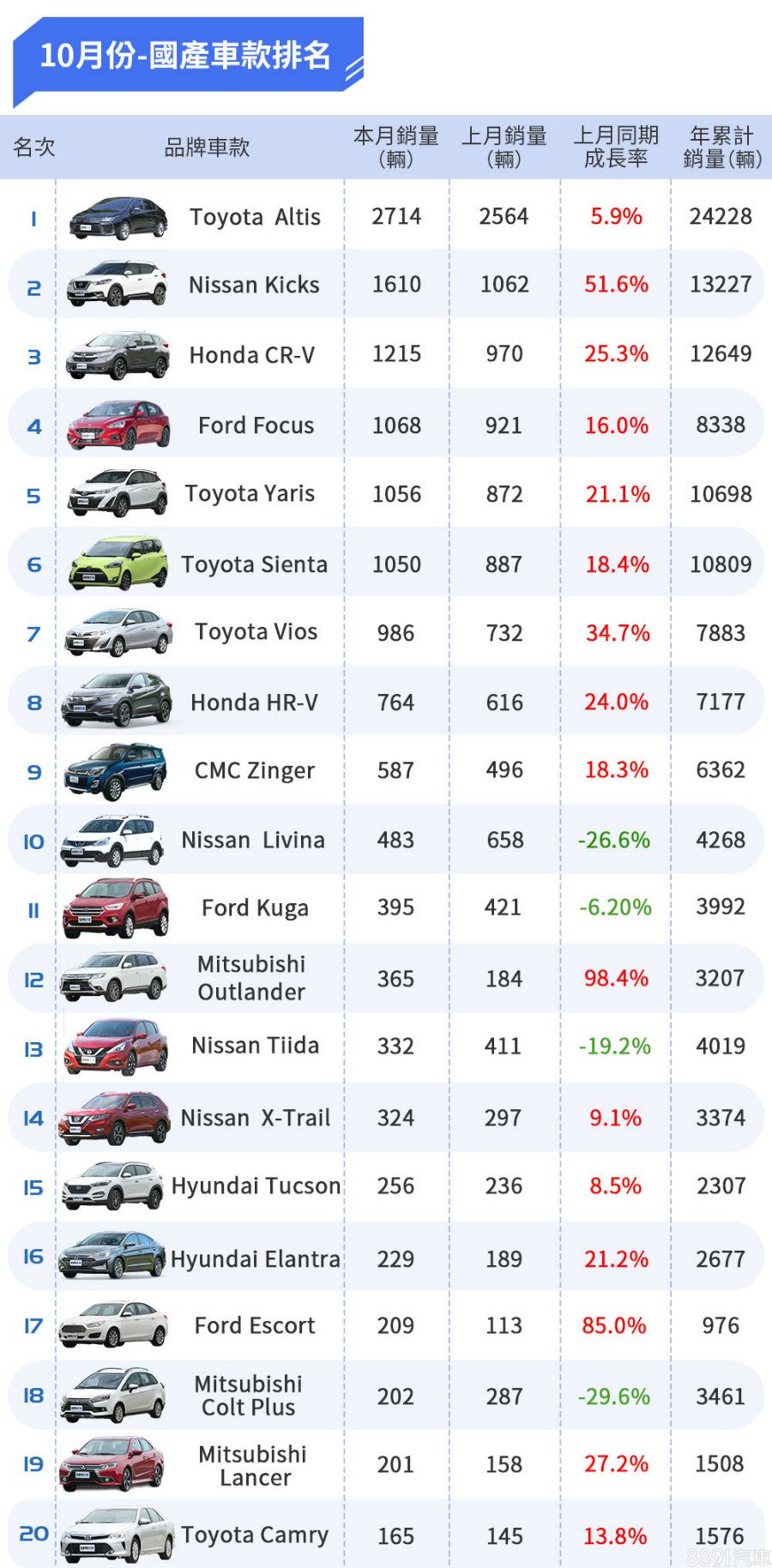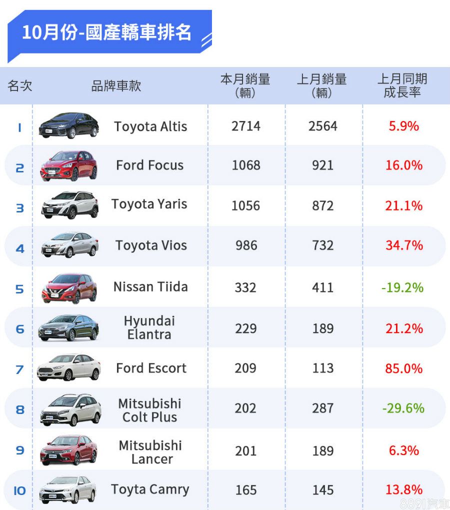 Toyota輛外兩款小車Yaris以及Vios也回歸了正常的銷售水準,位居第三名以及第四名的位置。而Ford另一款小車Escort在10月份推出了舊換新49.9萬的現金優惠價銷售手法,讓整體表現成長了85%之多,闖進了前10的名單當中。