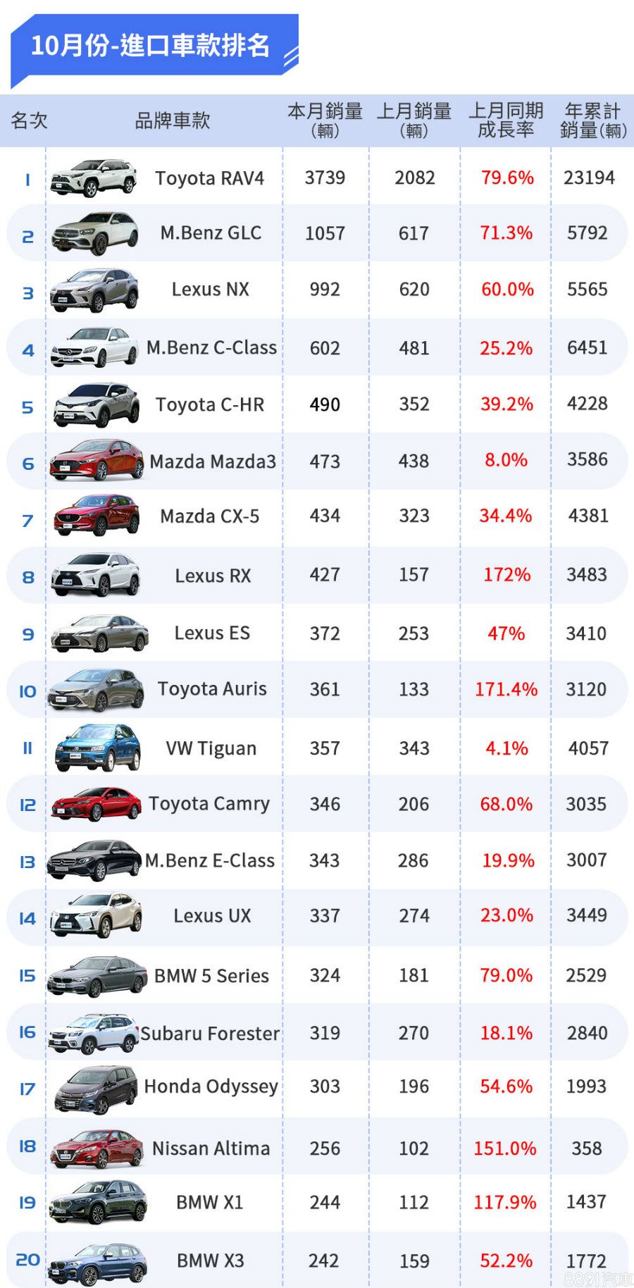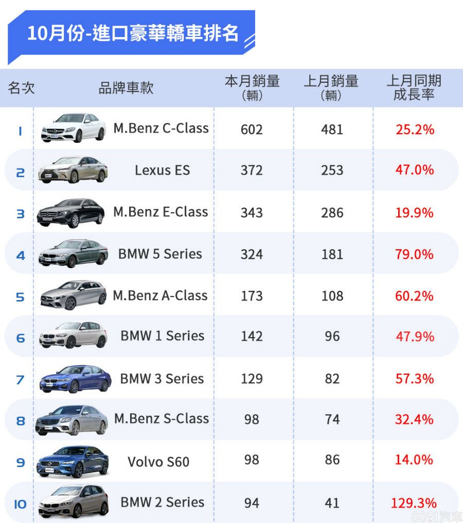 而在上月交出漂亮表現的電動車品牌Tesla本月則是新車尚未到港的關係,銷售表現不佳,全品牌僅有68輛的成績,待11月新車到港之後相信會又有不錯的表現。