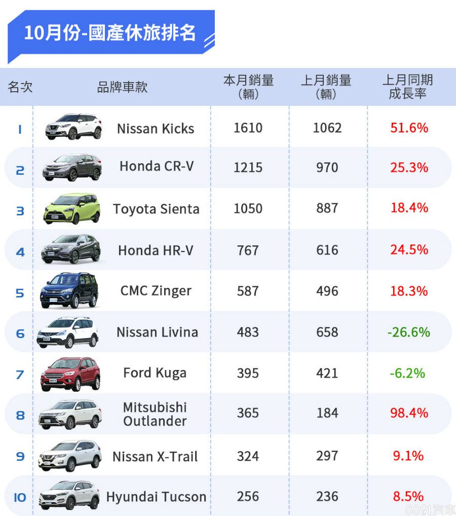 休旅市場方面可以看到Kicks連續第三個月位居龍頭寶座,CR-V雖繳出破千亮的成績仍不敵小型SUV的熱潮僅能在第二名的位置,另外可以看到Sienta也繳出了破千輛的成績單,穩居前段班的地位。