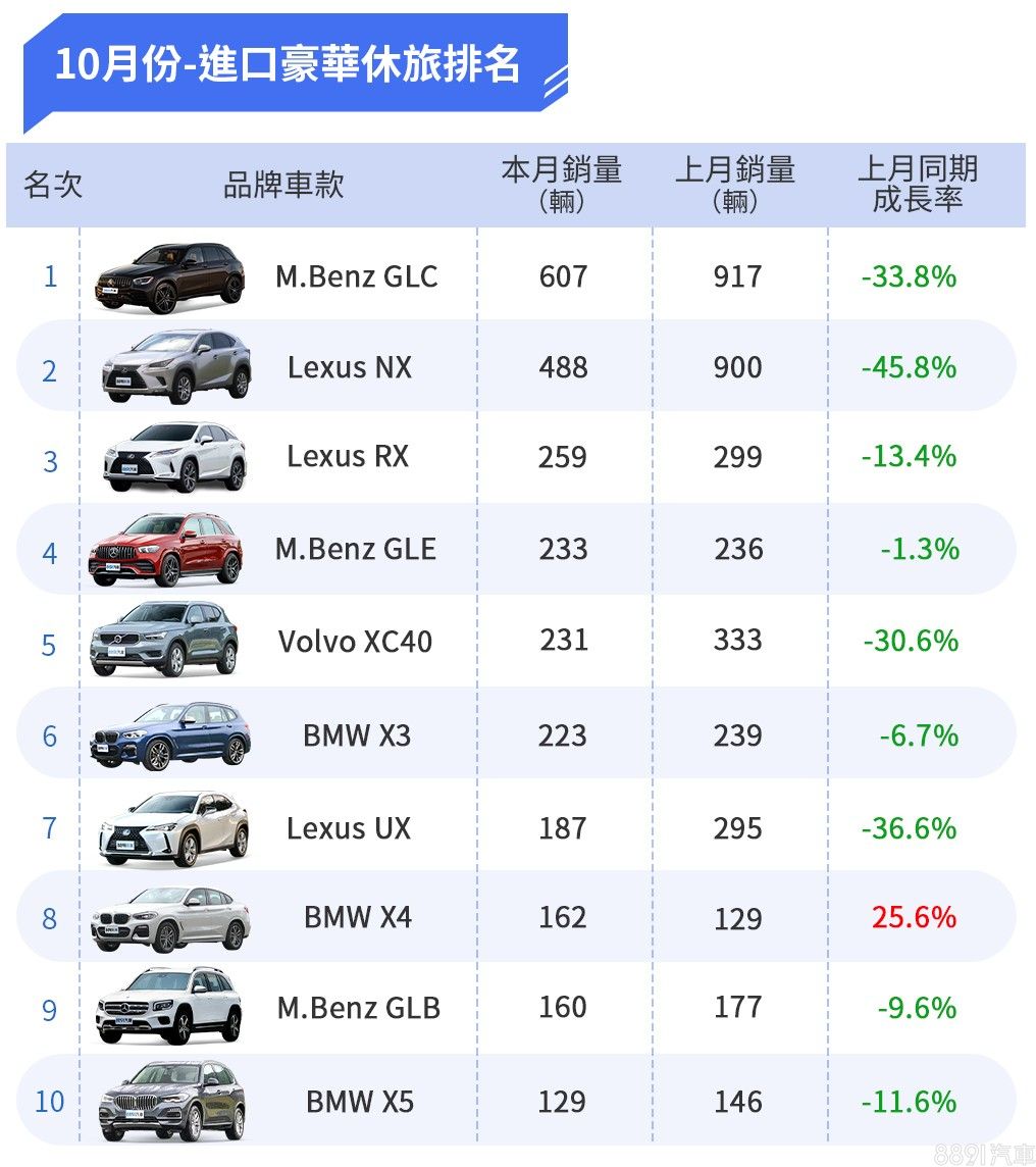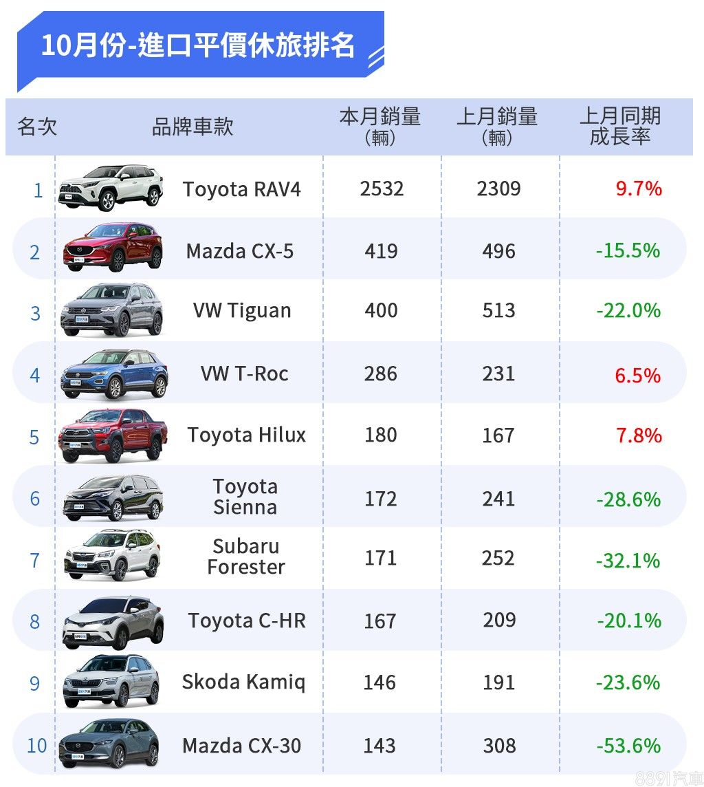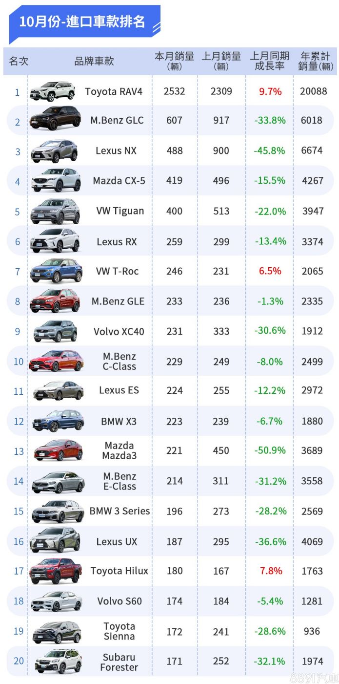 對比9月的「滿江紅」,10月進口車前20名榜單多數呈現下滑的「綠字」,冠亞季軍人員沒有異動,依舊是RAV4、GLC、NX,包含RAV4、T-Roc與Hilux都是少數較上月賣更好的車款。