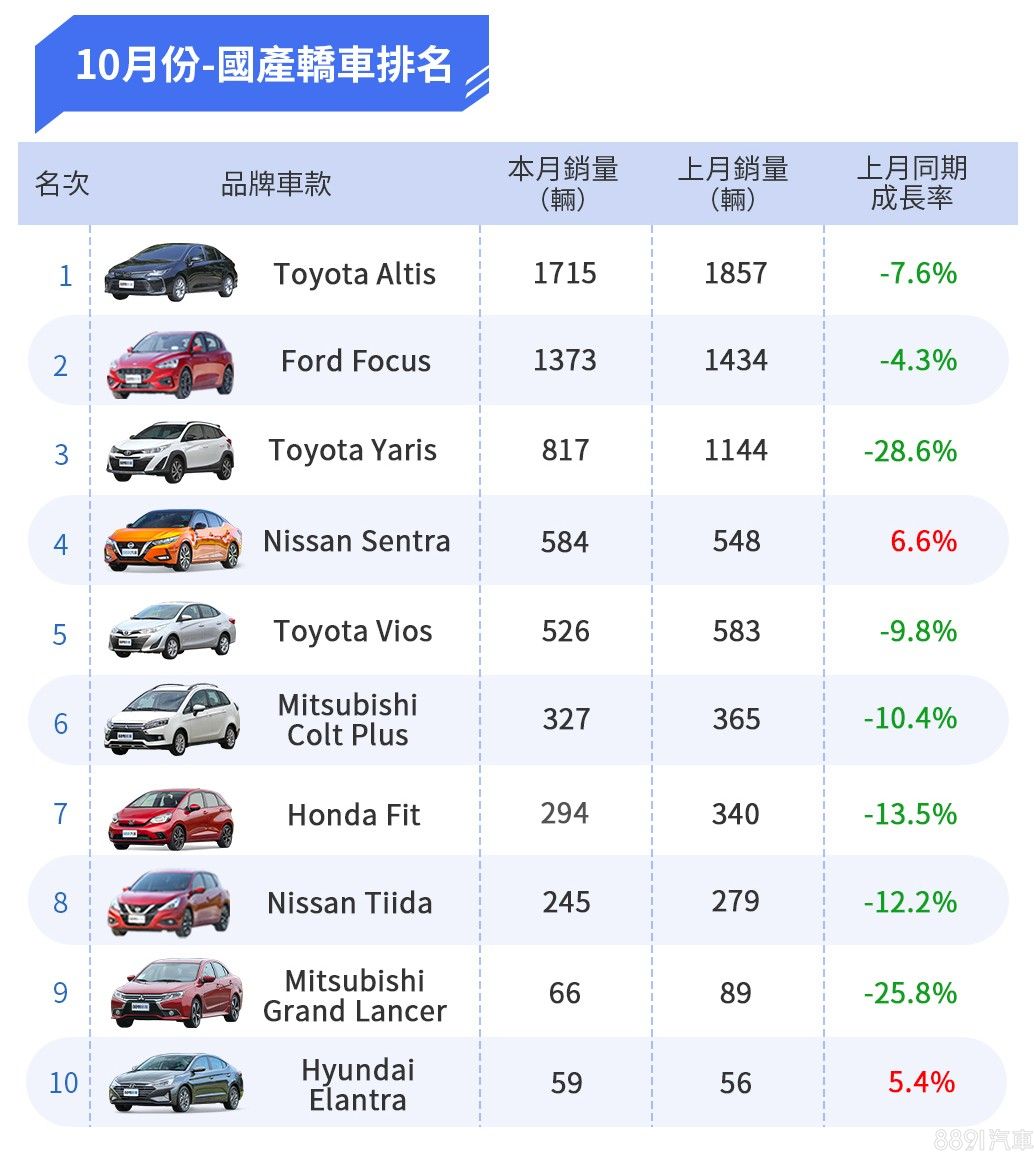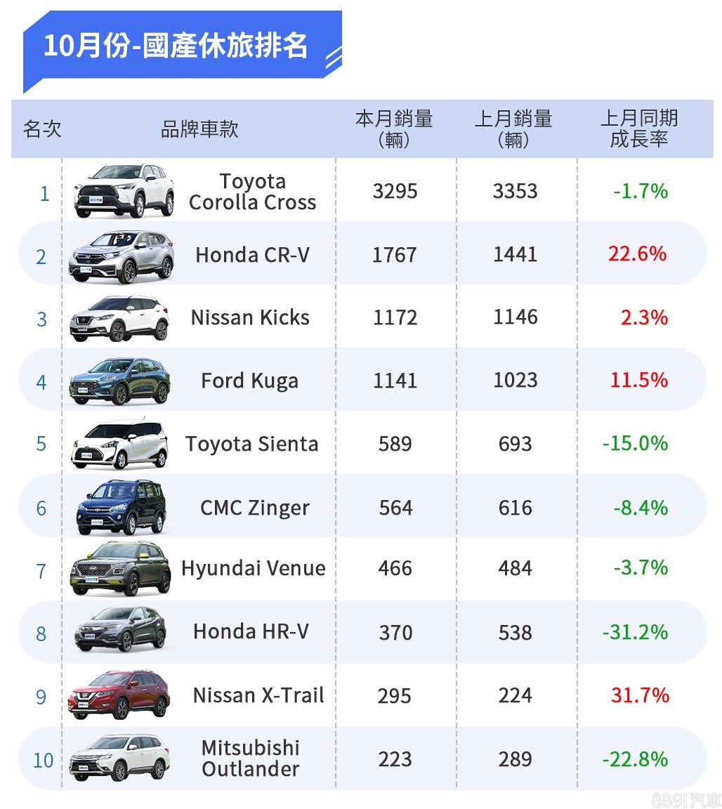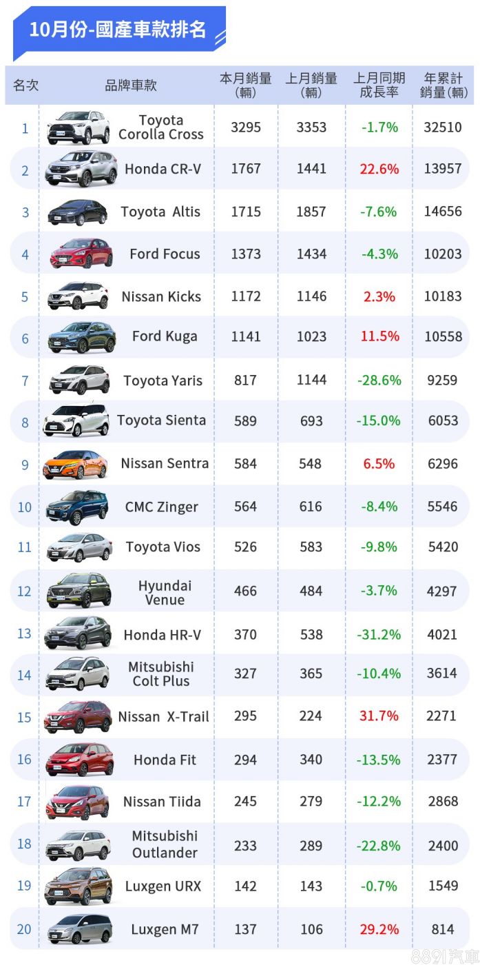 雖然相較9月,國產車整體銷售衰退,但幅度不算太大,熱賣車款還是多維持一定水準,如Toyota Corolla Cross、Honda CR-V、Ford Focus、Nissan Kicks等,掛牌數就算下跌也有限,前10名中仍有6台車款銷量破千。