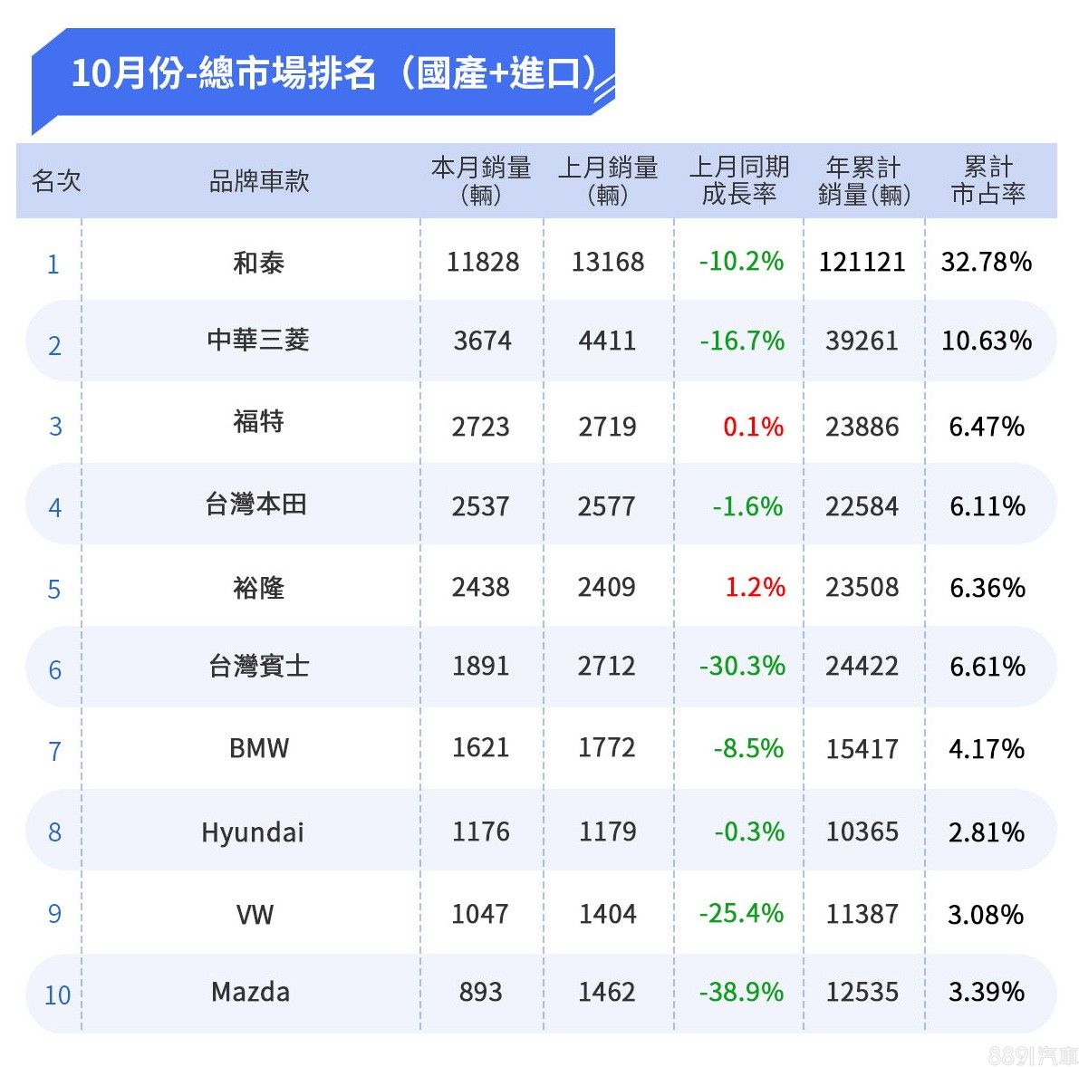 10月台灣汽車總市場呈現下滑,進口車更是嚴重,掛牌數來到14348輛,相比9月衰退了23.7%之多,市佔率也從9月的45.7%下探至40.6%,罕見的滑落至4成出頭。