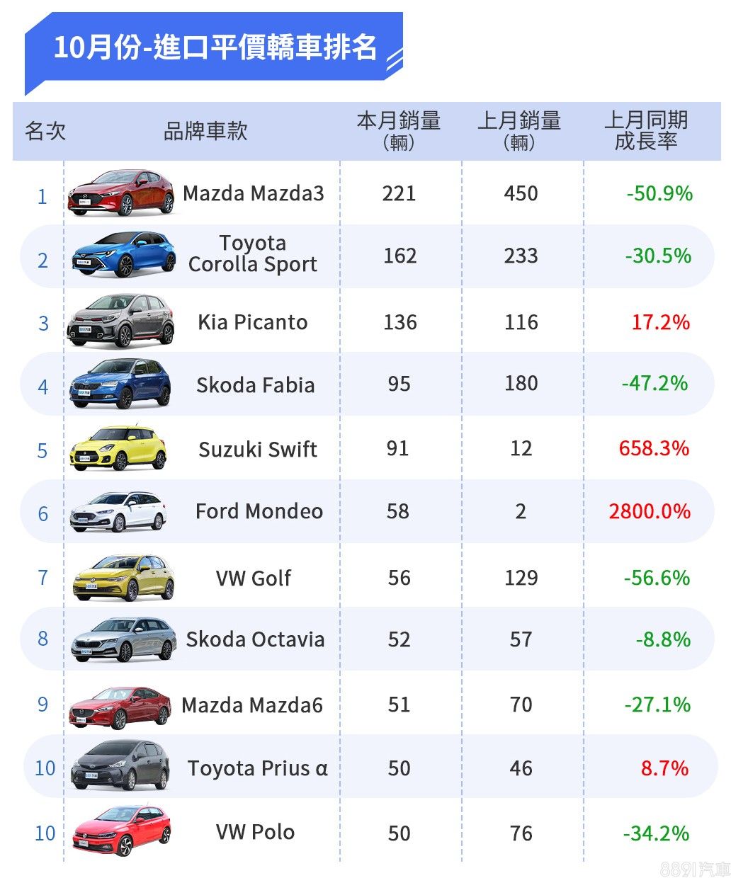 前2名依舊由Mazda3與Corolla Sport獨占鰲頭,也是本榜單少數銷量破百的車款,原本第3名的Camry名次下滑,而且據和泰先前公告,部分進口車因價格調漲暫停接單,Camry就是其中受影響的車款之一。