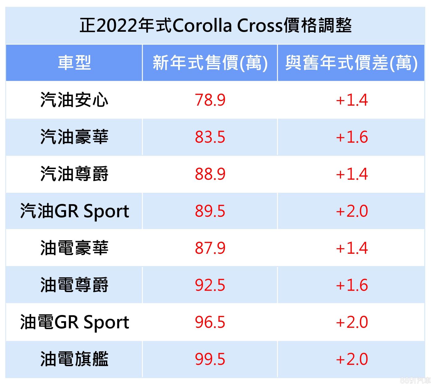 去年銷量突破4萬輛、甫剛拿下台灣最暢銷車款的Corolla Cross,最新公布的正22年式維持雙動力、8車型可選,標準車型漲幅1.4~2.0萬不等,最頂規的油電旗艦已逼近百萬門檻,而GR Sport運動化版本統一上調2萬。