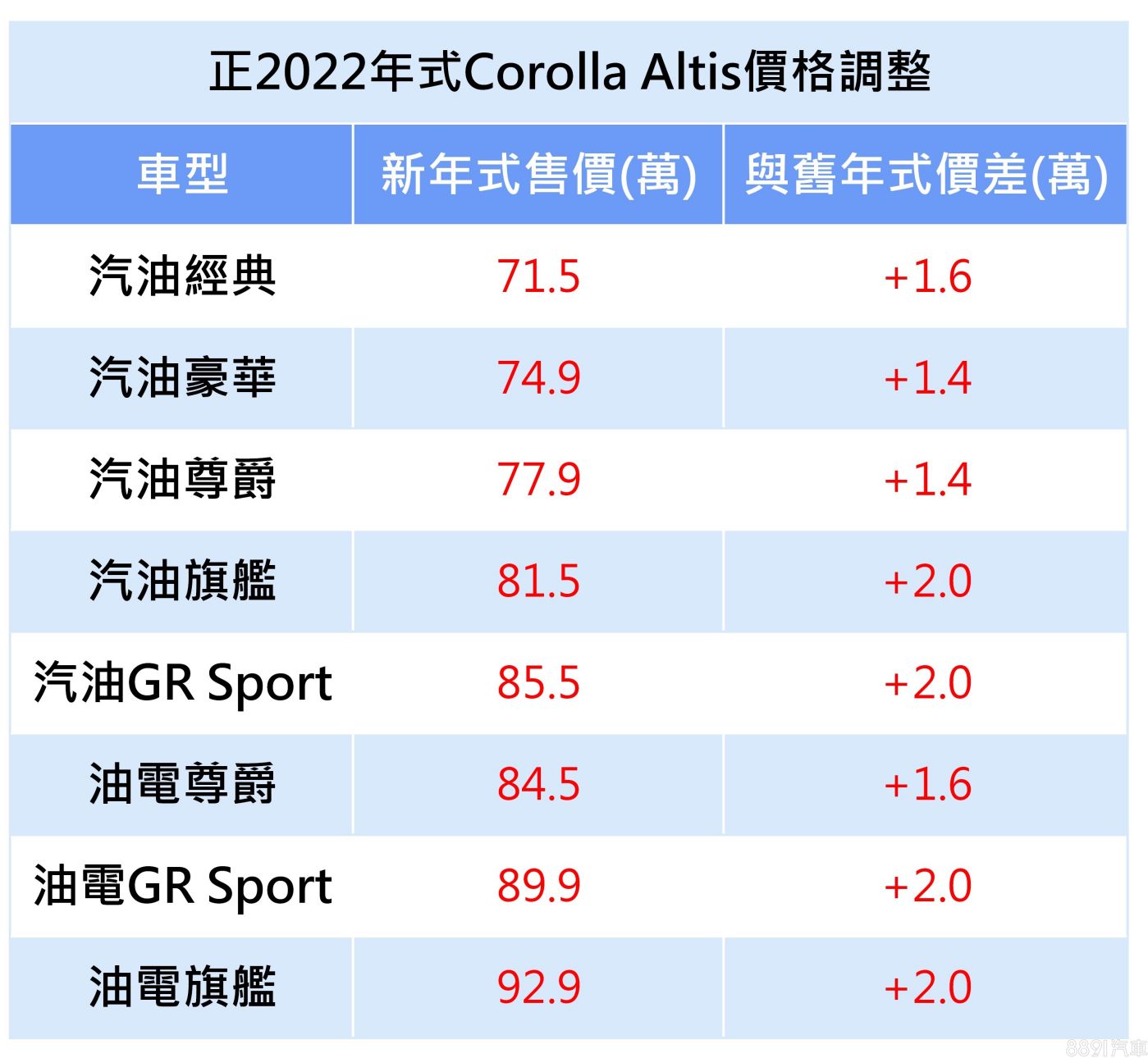 雖然已被同門師弟Corolla Cross逼下神壇,但Altis去年仍以1.8萬輛穩坐亞軍席次,正22年式維持雙動力、8車型可選,售價自71.5萬起至92.9萬,較先前調漲1.4~2.0萬不等。