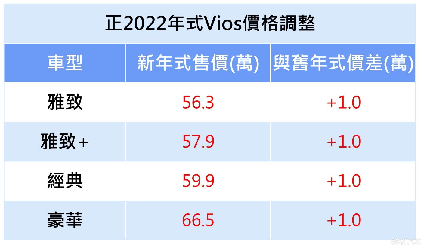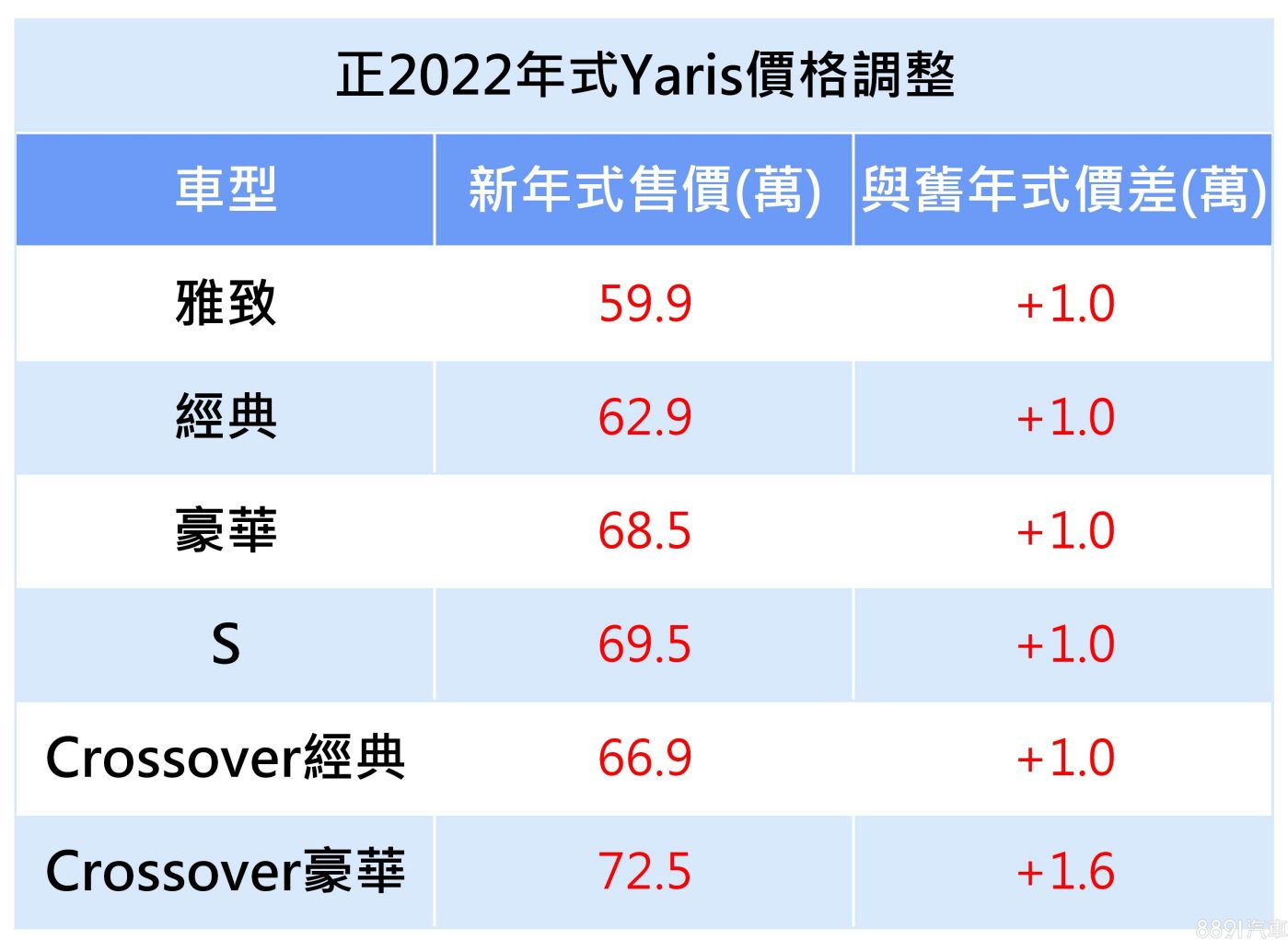 正22年式的Vios、Yaris也搶搭漲價的順風車,前者統一漲價1萬、後者除Crossover豪華版調高1.6萬外,其餘版本均上漲1萬。